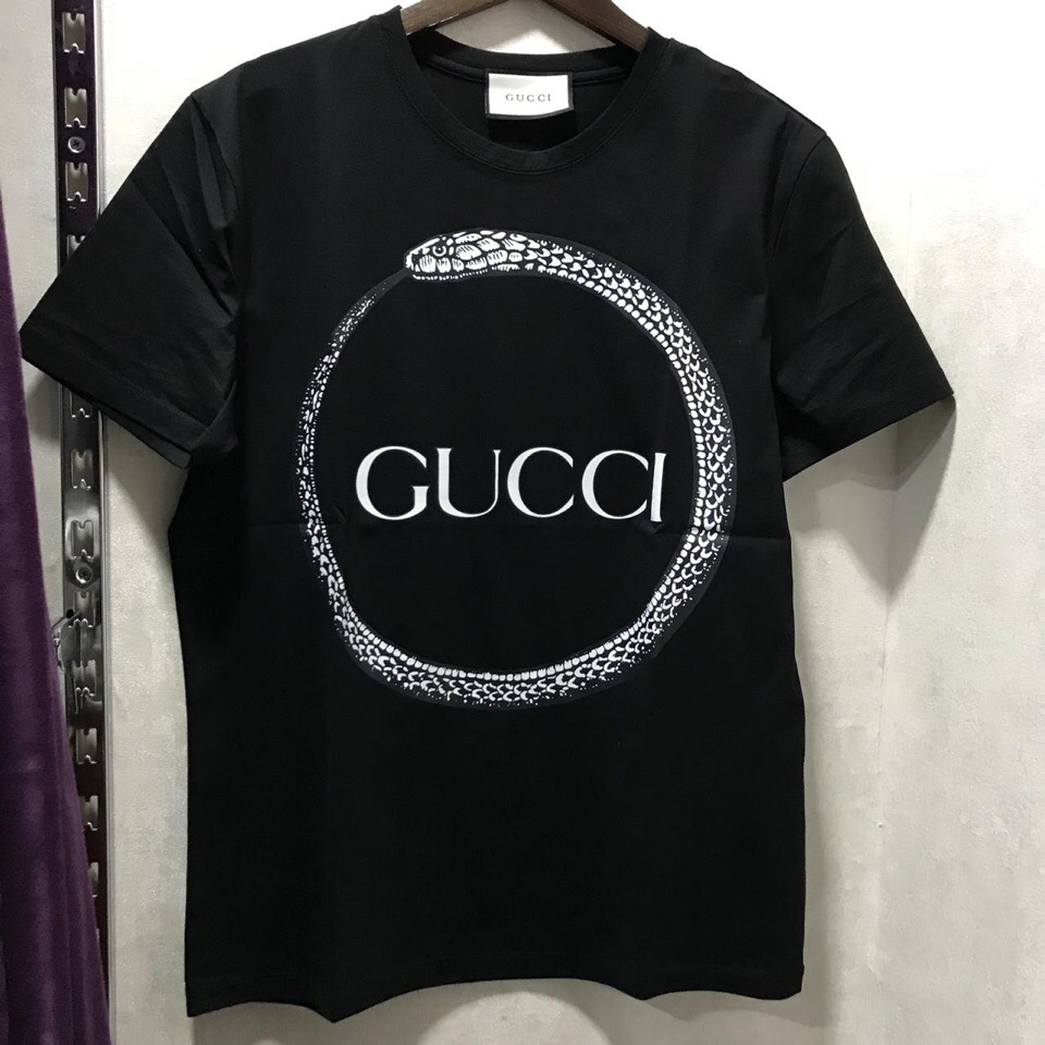 Футболка Gucci ОДМ-003 представляет собой стильную и узнаваемую вещь от известного бренда. Данная модель выполнена в классическом черном цвете, что делает ее универсальной и подходящей для создания разнообразных образов. Оригинальный принт с изображением змеи, обвивающей логотип Gucci, придает футболке уникальности и выразительности.