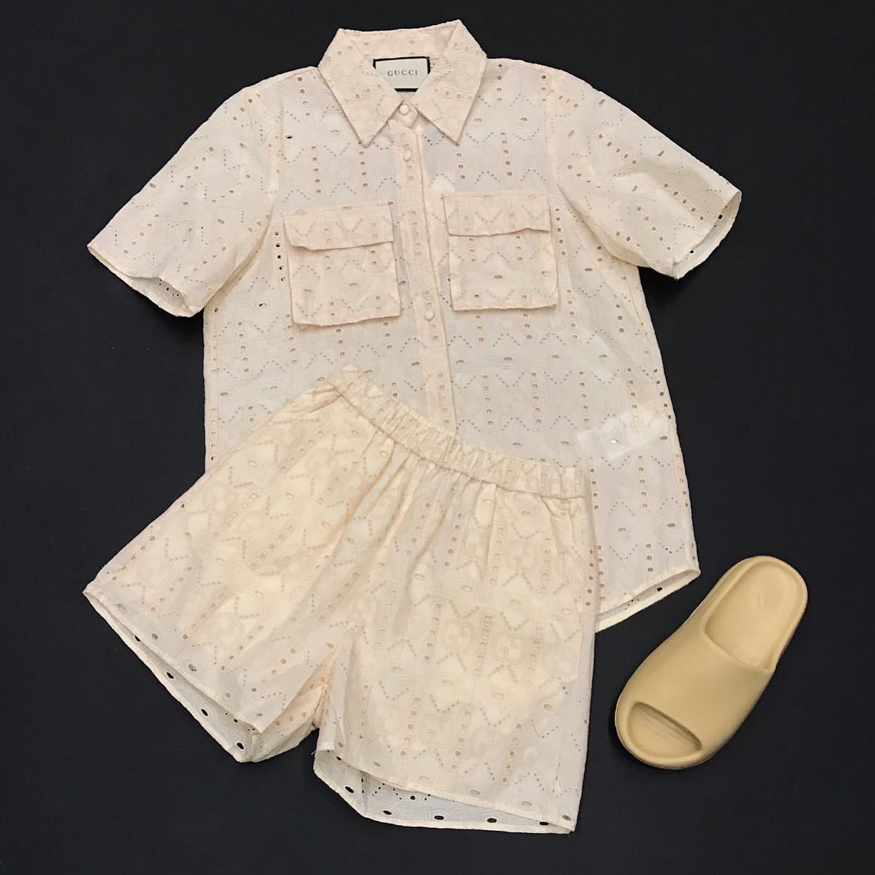 Этот женский костюм Gucci LUX-34281 представляет собой элегантный комплект, выполненный в нежном кремовом оттенке. Дизайн сочетает в себе классический крой рубашки с отложным воротником и накладными карманами, а также удобные шорты с эластичным поясом. Отличительной чертой костюма является изысканная перфорация по всей ткани, придающая изделию легкость и утонченность.