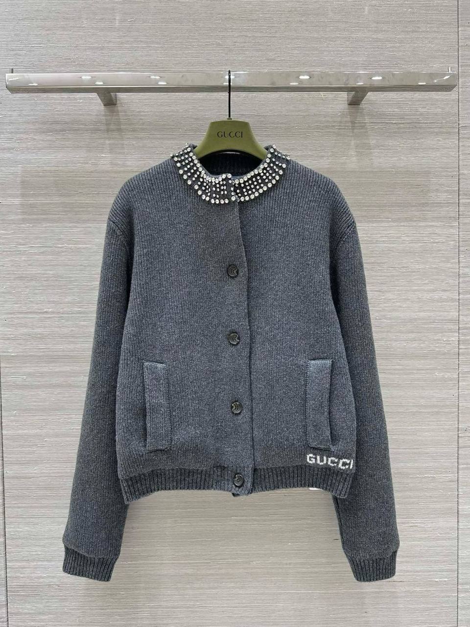 Бомбер Gucci LUX-113135 – это воплощение стиля и элегантности. Этот бомбер выполнен в классическом стиле, с элегантным воротником, декорированным сверкающими камнями. Его серый цвет и мягкая текстура делают его универсальным предметом гардероба, который подойдет для различных образов.