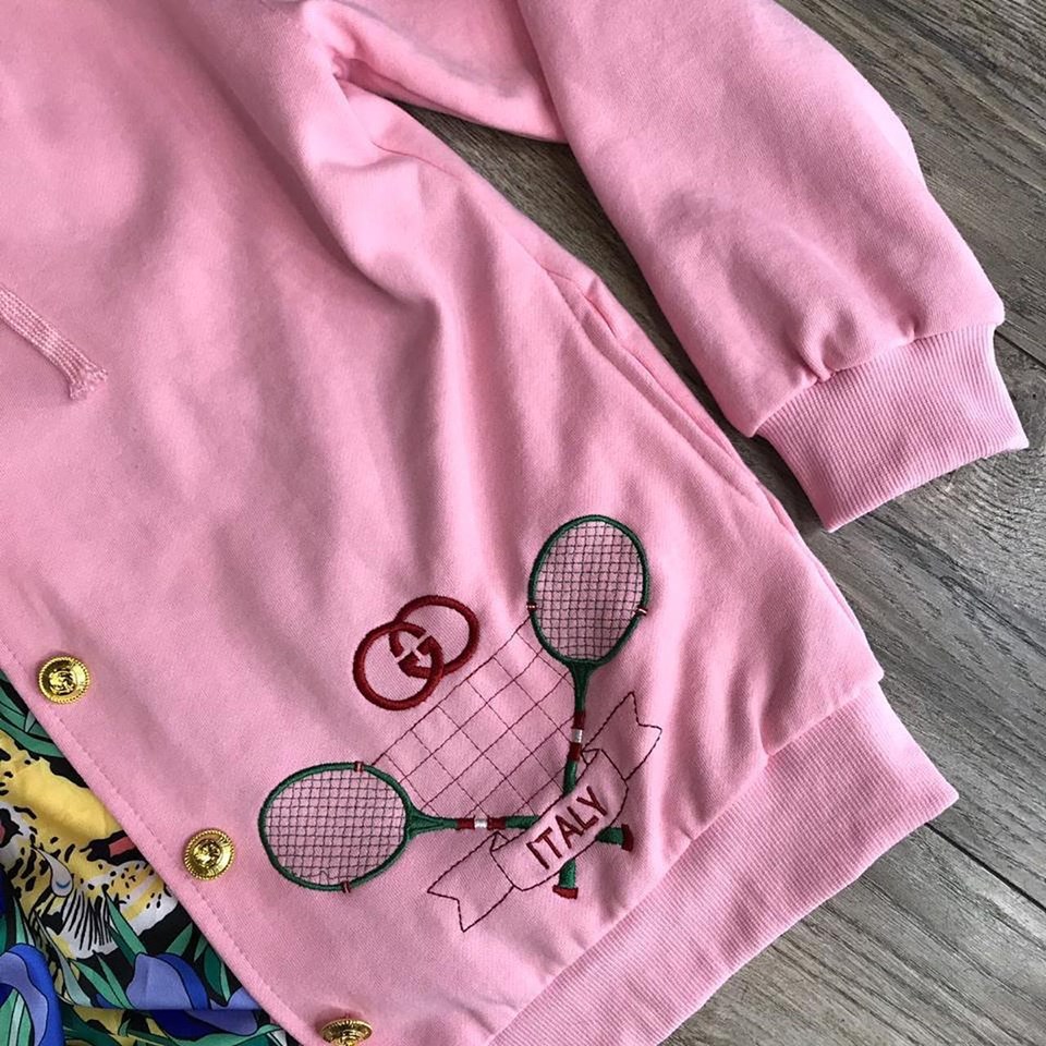 Стильный розовый бомбер Gucci LUX-18160 с капюшоном от бренда Gucci — это яркое сочетание спортивного стиля и роскоши. Бомбер украшен вышивкой с изображением теннисных ракеток и логотипом бренда, а подкладка выполнена в экзотическом принте с тиграми и тропическими листьями, что придает изделию уникальность. Эта модель идеально подходит для создания эффектных повседневных образов.