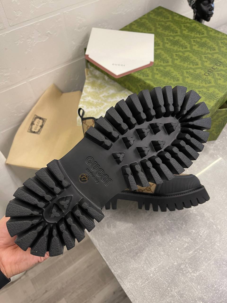 Ботинки Gucci LUX-97987 — это стильная обувь в узнаваемом стиле бренда. Ботинки выполнены в бежево-коричневых тонах с фирменным узором GG и черными вставками и подошвой. Их дизайн сочетает в себе элегантность и практичность, делая их отличным выбором для повседневной носки.