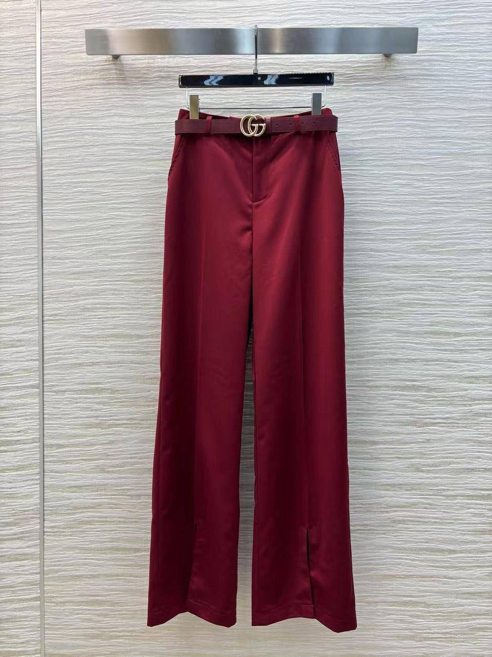 Брюки Gucci LUX-118112 — это элегантные брюки палаццо бордового цвета. Классический дизайн с высокой посадкой и широкими штанинами. Брюки комплектуются ремнем с пряжкой, создавая завершённый образ.