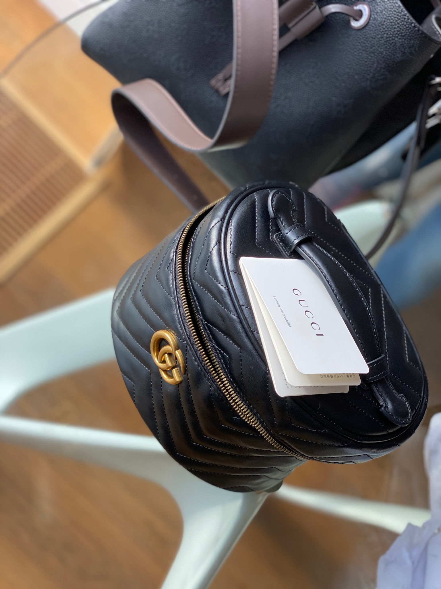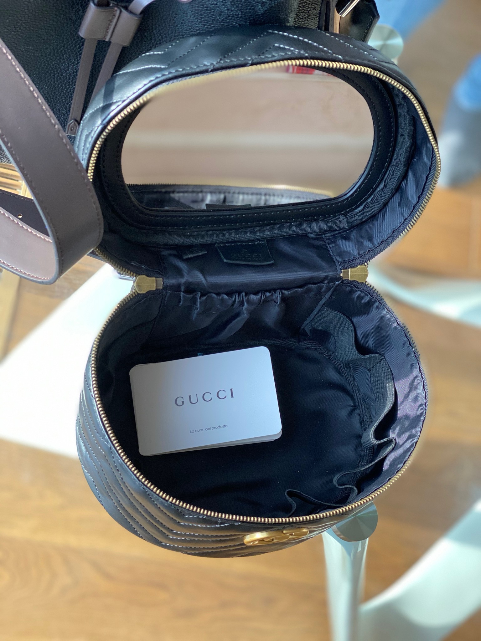 Бьюти-кейс Gucci LUX-27044 представляет собой элегантный и практичный аксессуар, выполненный в классическом черном цвете. Дизайн отличается фирменной стежкой "матрона" и золотистой фурнитурой, включая узнаваемый логотип GG, что подчеркивает его принадлежность к люксовому бренду. Эта модель идеально подходит для хранения косметики и туалетных принадлежностей, сохраняя их в идеальном порядке.