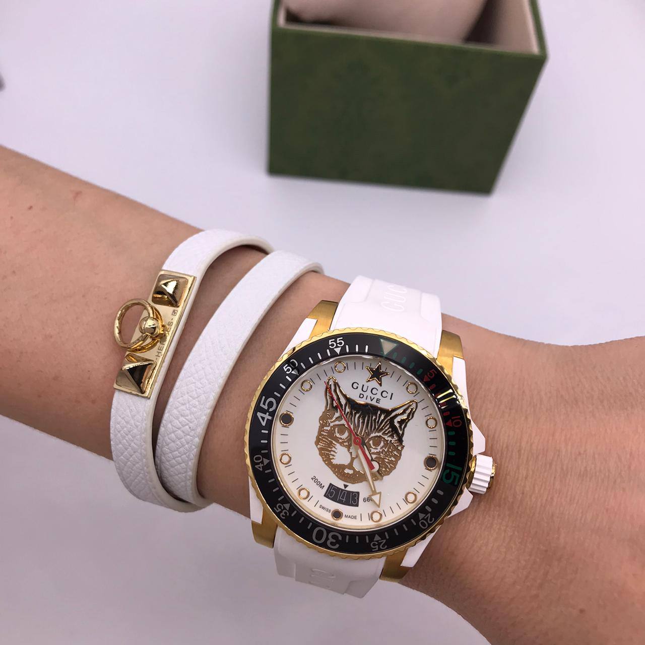 Часы Gucci LUX-70833 представляют собой элегантный аксессуар, сочетающий в себе современный дизайн и роскошь. Белый силиконовый ремешок гармонирует с золотистым корпусом и циферблатом, украшенным изображением кошки. Эти часы станут ярким акцентом в вашем образе, подчеркивая индивидуальность и стиль.
