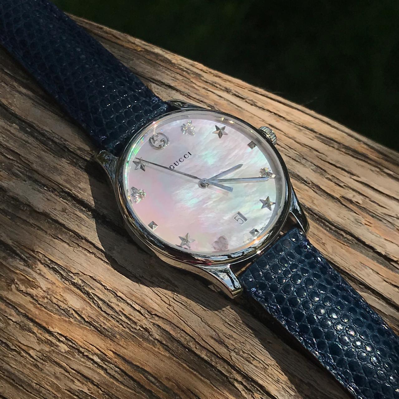 Эти элегантные часы Gucci АКС-308, выполненные в классическом стиле, станут изысканным дополнением к любому образу. Перламутровый циферблат с инкрустацией в виде звезд, пчел и сердец придает им особый шарм. Идеальный выбор для женщин, ценящих утонченность и высокое качество.