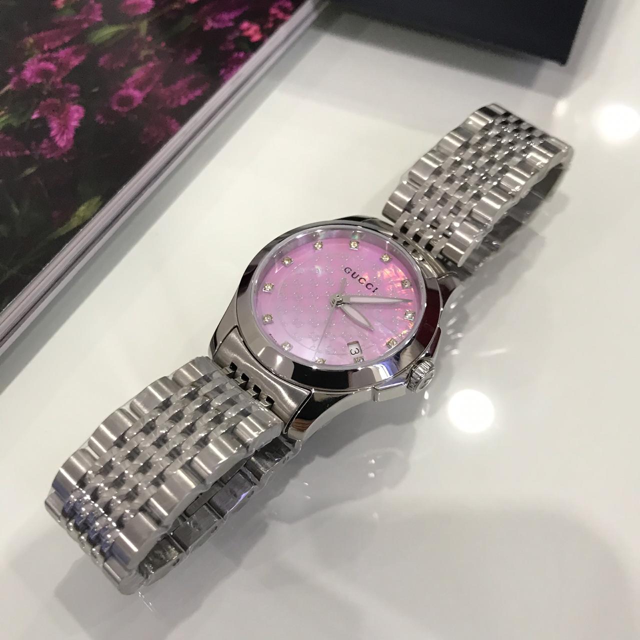 Часы женские Gucci LUX-26583 - это изысканный аксессуар, который подчеркнет ваш неповторимый стиль. Модель выполнена в классическом дизайне с современными акцентами. Перламутровый циферблат нежно-розового оттенка, украшенный логотипами бренда и инкрустированный кристаллами, притягивает взгляды. Элегантный стальной браслет и корпус создают гармоничный образ.