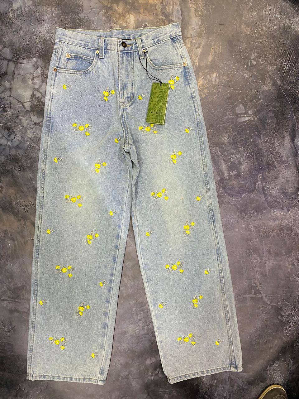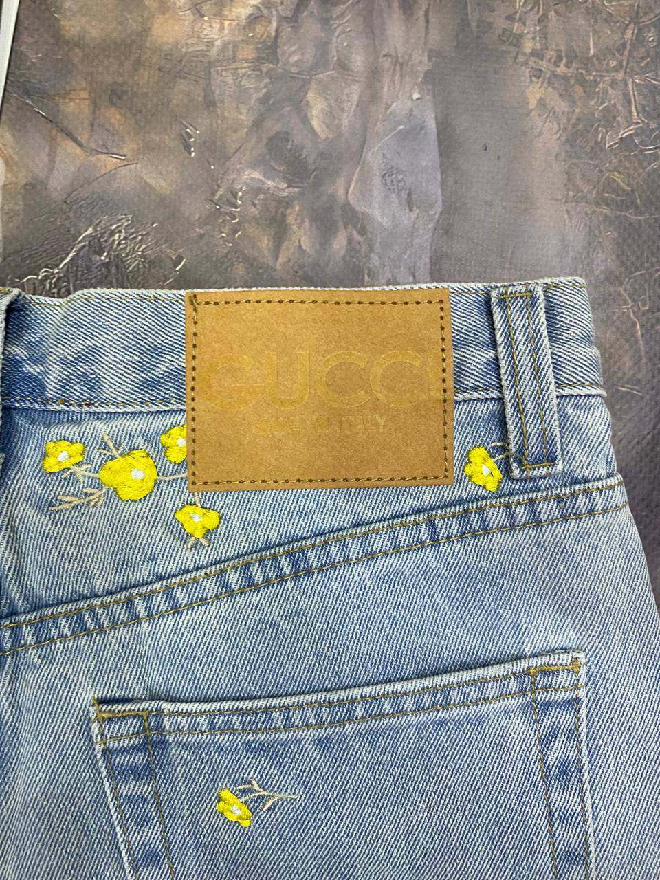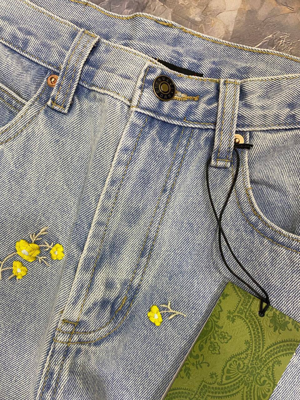 Джинсы Gucci LUX-101847 — это стильные джинсы прямого кроя, выполненные в светлом дениме. Они украшены яркой вышивкой в виде желтых цветов, что придает им свежий и оригинальный вид. Такие джинсы подойдут для создания как повседневных, так и более нарядных образов.