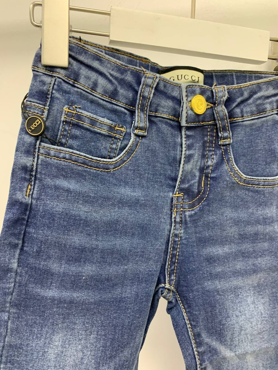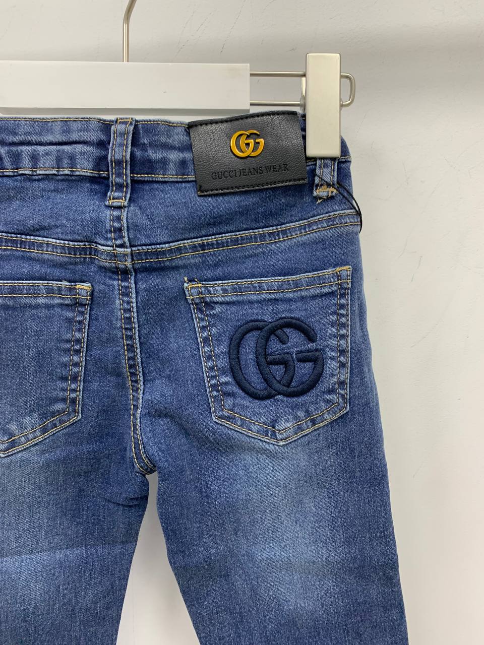 Джинсы Gucci LUX-93334 - это стильные детские джинсы классического кроя. Они выполнены в синем цвете, имеют потертости, добавляющие модели уникальность и современный вид. Данная модель может стать отличным выбором для повседневной носки, создавая комфортный и модный образ.