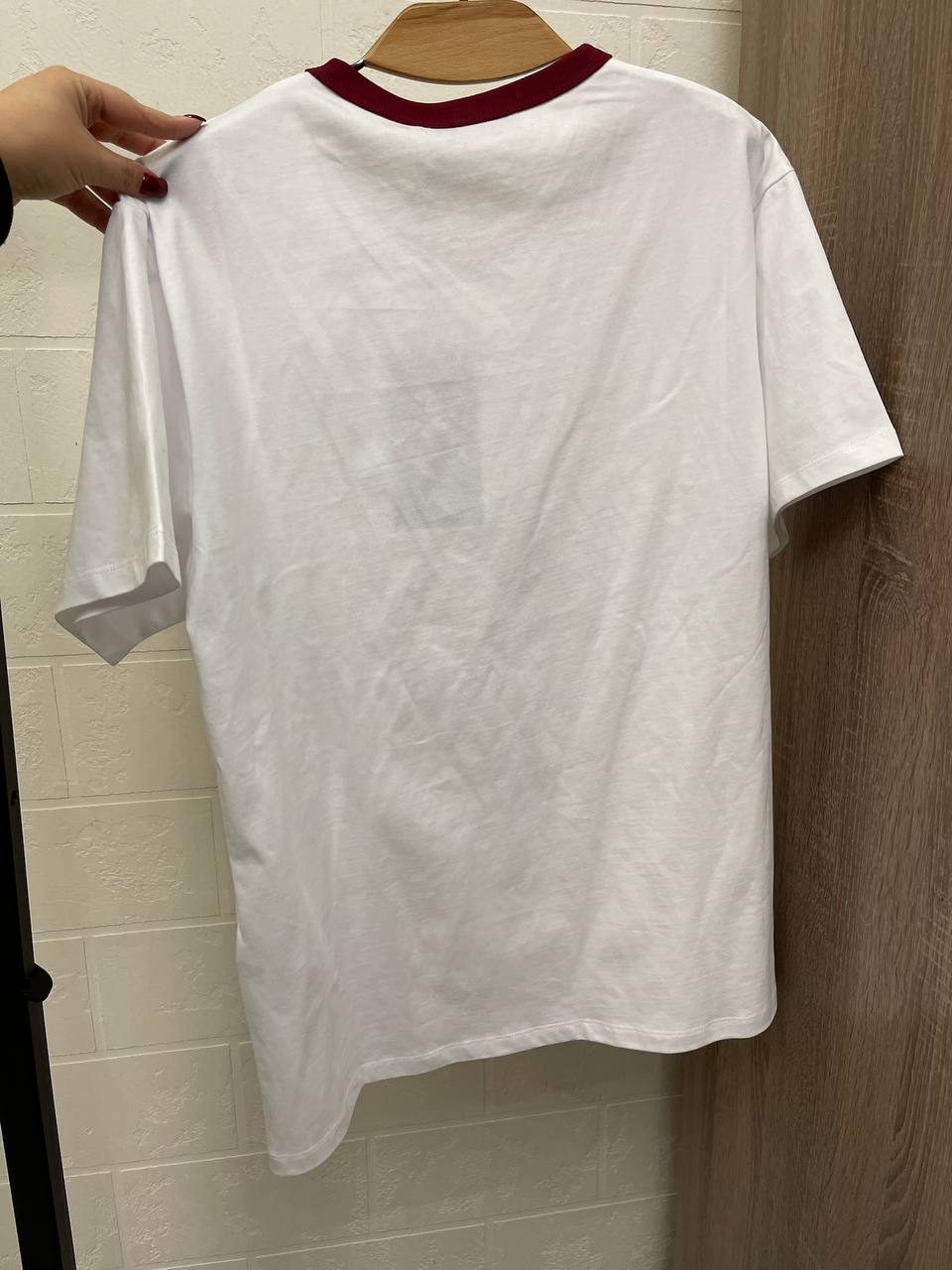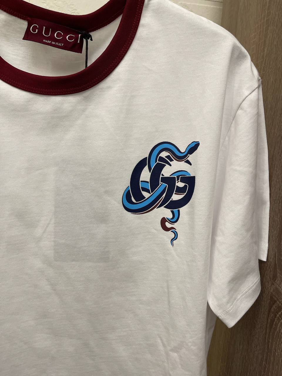 Футболка Gucci LUX-114584 представляет собой стильный предмет гардероба, который сочетает в себе комфорт и элегантность. Белый цвет футболки дополняется бордовым воротником и оригинальным принтом с изображением змеи. Идеально подходит для создания повседневных образов, подчеркивая индивидуальность и вкус.