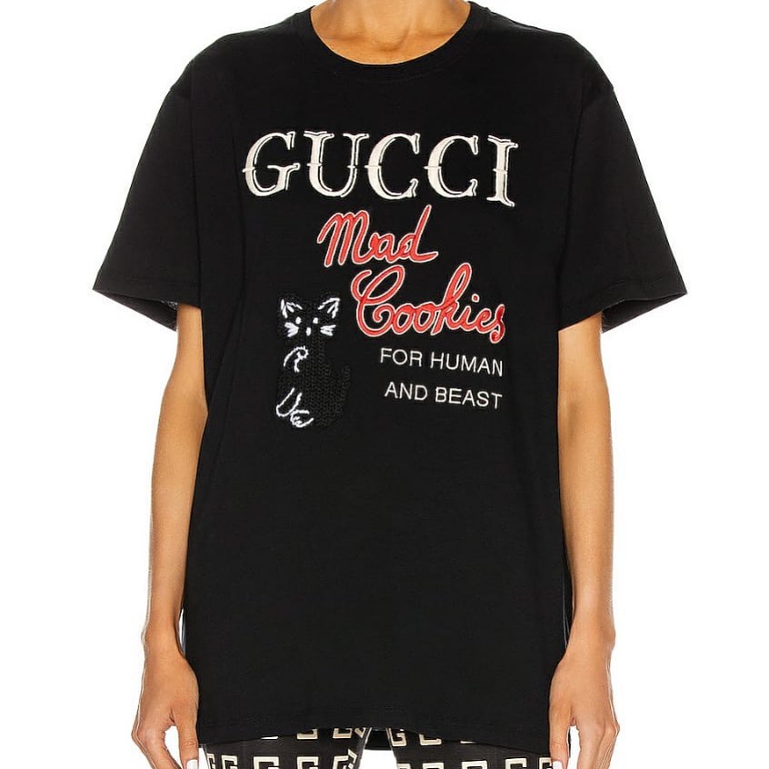 Футболка Gucci LUX-45235 – это стильный элемент гардероба, выполненный в черном цвете, с оригинальным принтом. На футболке размещен крупный логотип Gucci, а под ним надпись "Mad Cookies" красным цветом, дополненная изображением кота и текстом "FOR HUMAN AND BEAST". Эта футболка идеально подойдет для тех, кто ценит уникальный дизайн и хочет выделиться из толпы.