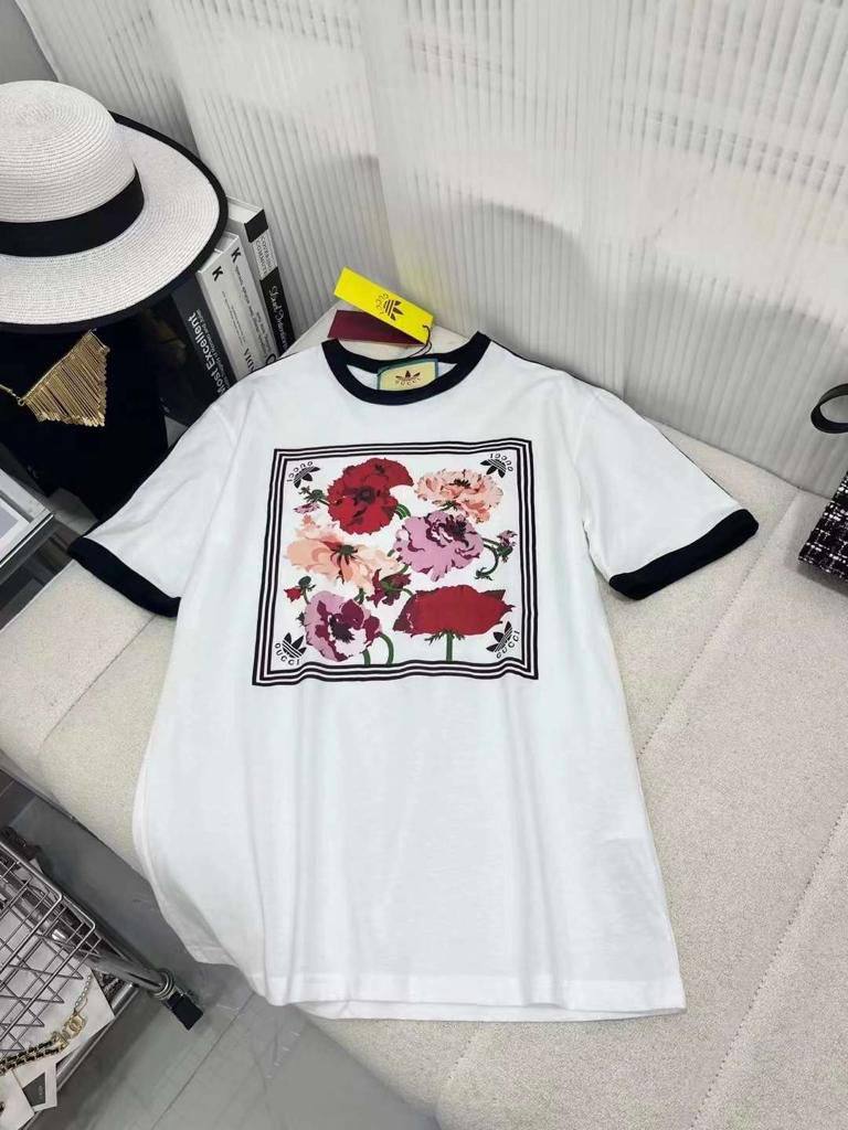 Футболка Gucci LUX-81493 - это стильный элемент гардероба от известного бренда. Футболка выполнена в белом цвете с контрастной черной отделкой по краям. На груди изображен яркий цветочный принт, придающий изделию изысканность и женственность.