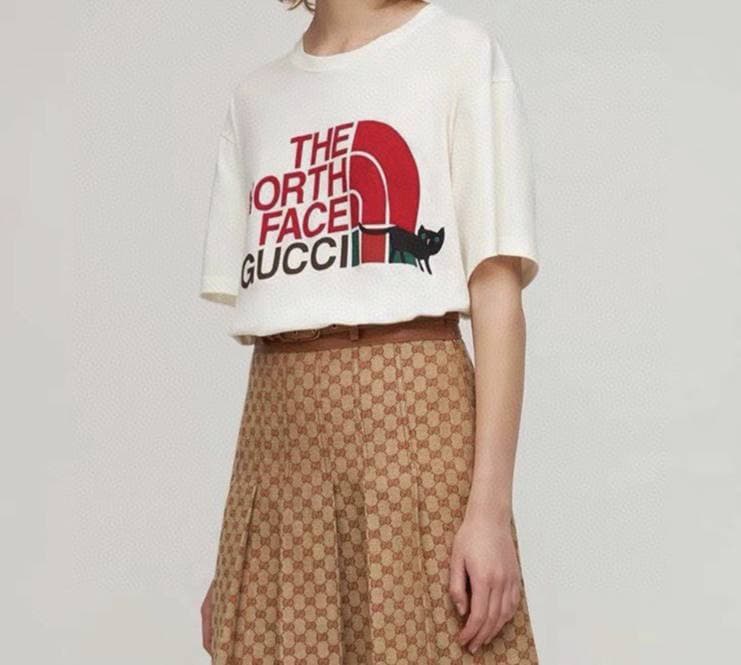 Gucci Футболка LUX-61357 - это стильная и модная футболка, которая идеально подойдет для создания современных и трендовых образов. Модель выполнена в кремовом цвете и украшена оригинальным принтом, сочетающим в себе элементы логотипов The North Face и Gucci, а также изображение черной кошки. Этот дизайн подчеркивает эксклюзивность и узнаваемость бренда.