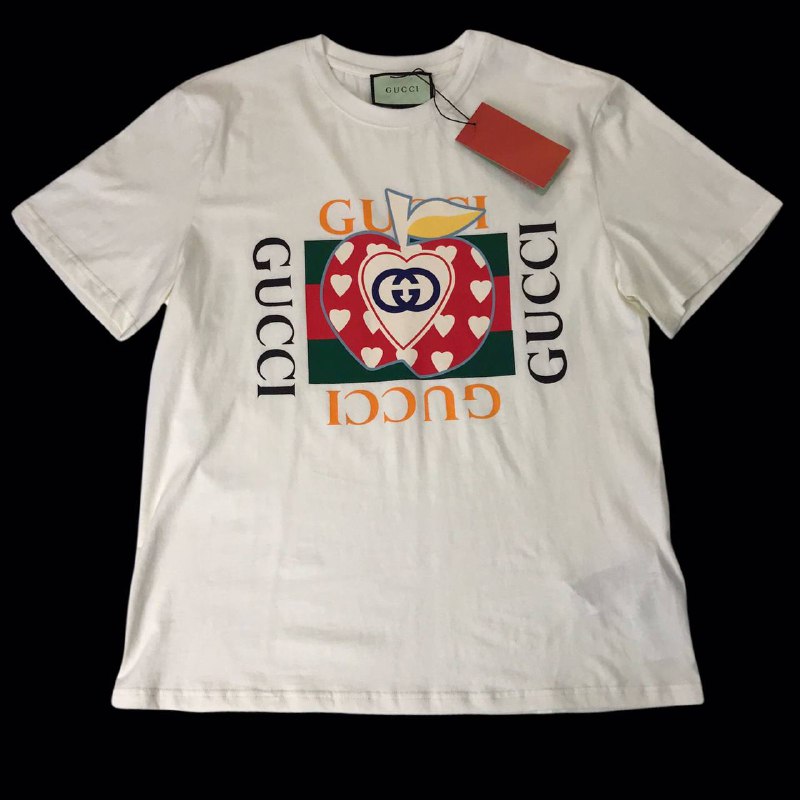 Футболка Gucci LUX-56065 выполнена в стиле унисекс, сочетая классический крой с ярким и узнаваемым дизайном. На передней части футболки расположен оригинальный принт в виде яблока, украшенный множеством сердечек и культовым логотипом Gucci, что придает изделию эксклюзивный вид.