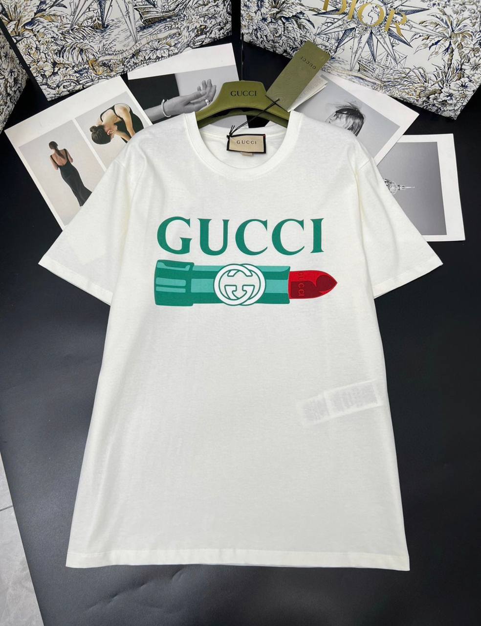 Футболка Gucci LUX-88635 – это стильный предмет гардероба от известного бренда. Футболка выполнена в белом цвете с ярким принтом в виде логотипа бренда и помады. Она отлично подходит для создания модных и запоминающихся образов в повседневной жизни.