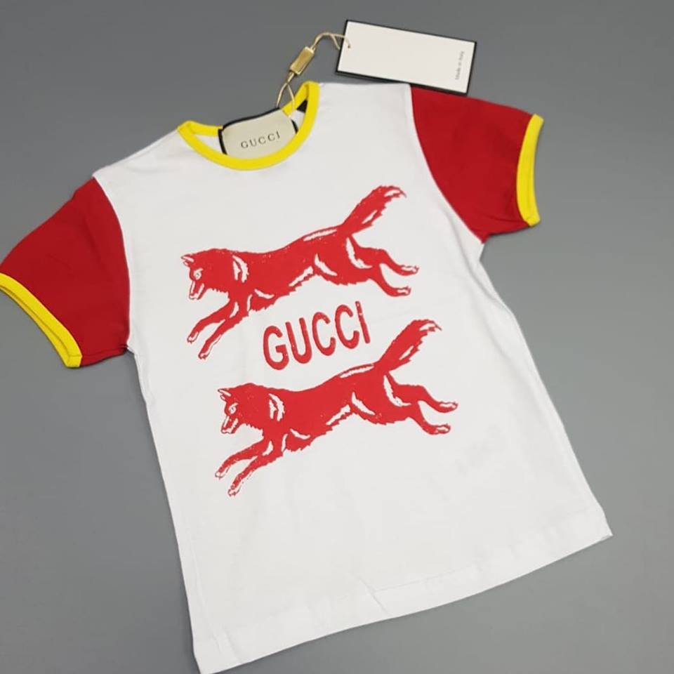 Эта детская футболка Gucci LUX-11687 сочетает в себе игривый дизайн и высокое качество, что делает ее идеальным выбором для стильных малышей. Белый фон дополнен яркими красными рукавами и контрастной желтой отделкой ворота, создавая привлекательный образ. Центральный элемент – два стилизованных изображения красных волков и логотип Gucci, подчеркивающий эксклюзивность бренда.