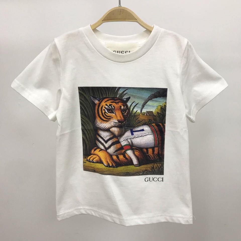 Детская футболка Gucci LUX-27087 выполнена в классическом белом цвете и отличается оригинальным принтом с изображением тигра. Этот стильный элемент гардероба от Gucci идеально подойдет для юных модников, добавляя образу яркости и индивидуальности.