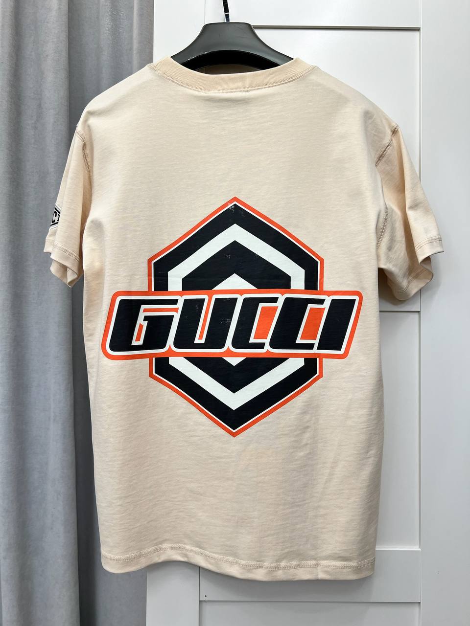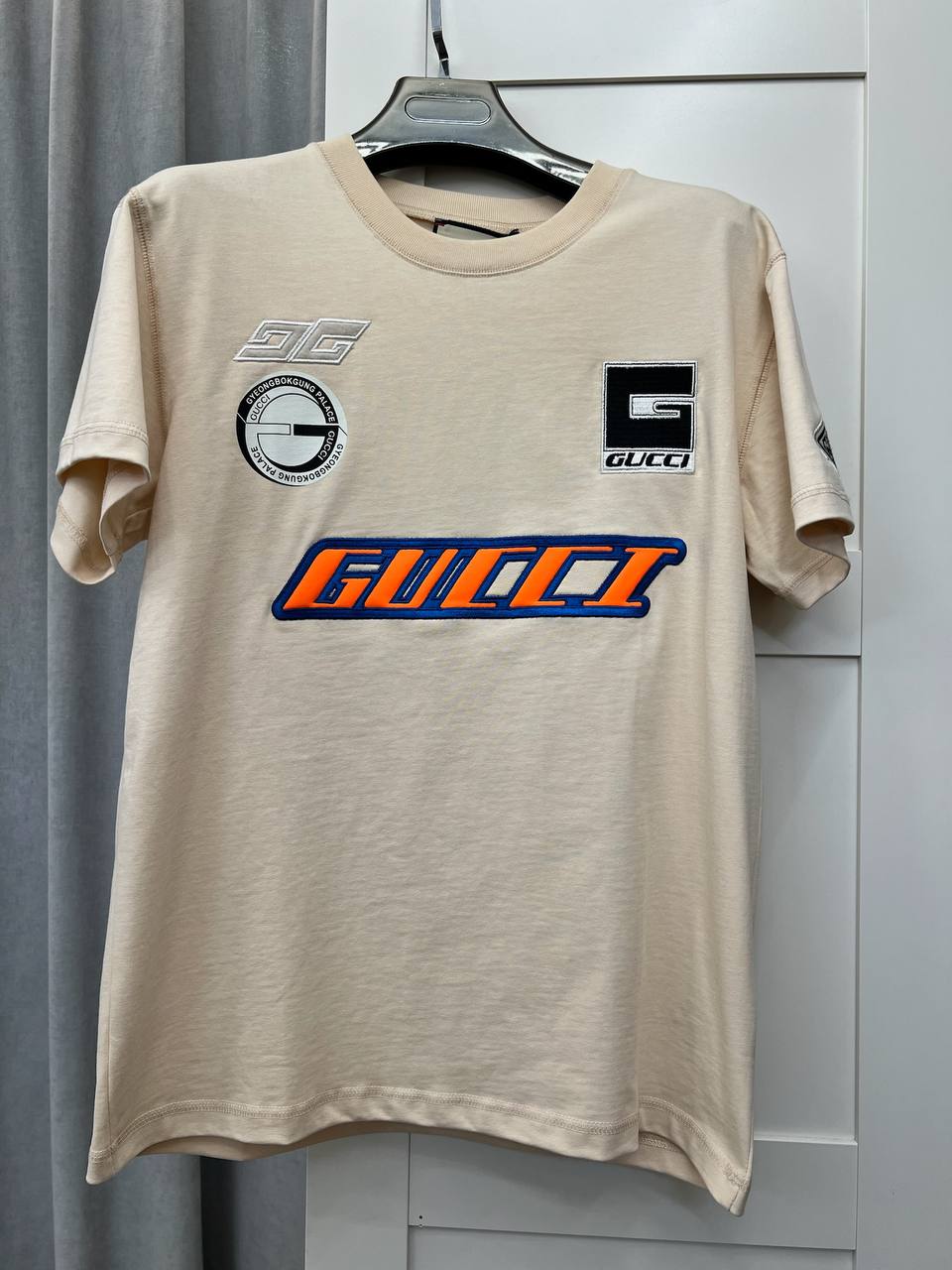 Футболка мужская Gucci LUX-104555 выполнена в спортивном стиле. Основной цвет - бежевый. Футболка украшена яркими нашивками, логотипами бренда и надписью «GUCCI». Модель подойдет для создания повседневных образов.