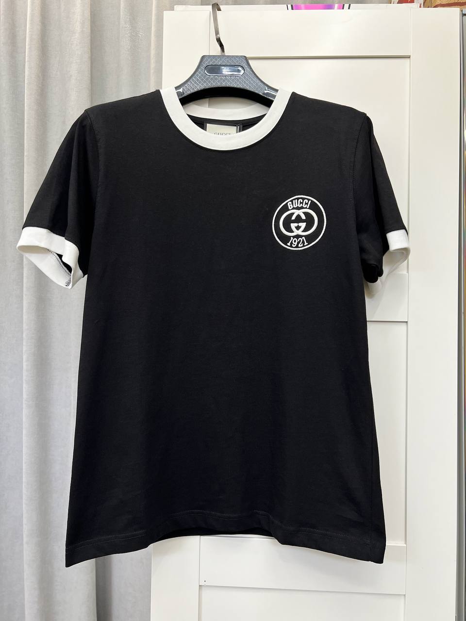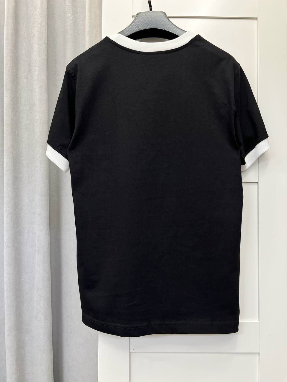 Футболка мужская Gucci LUX-104564 — стильный предмет гардероба от известного бренда. Футболка выполнена в классическом стиле с контрастными деталями. Основной цвет — черный, с белыми вставками на воротнике и рукавах. На груди расположен принт с логотипом бренда.