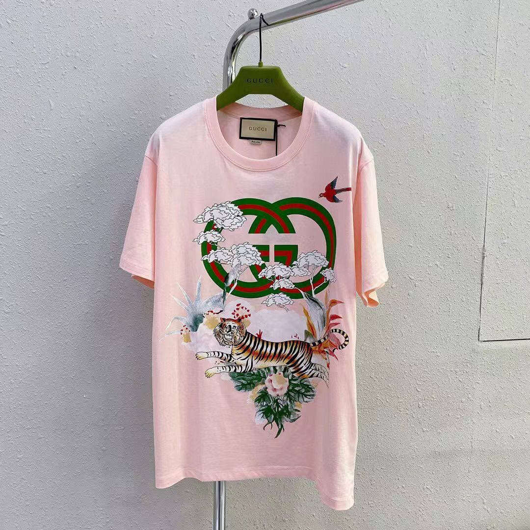 Футболка женская Gucci LUX-62219 представляет собой стильный и яркий элемент гардероба, выполненный в узнаваемом стиле бренда Gucci. Розовый цвет футболки подчеркивает ее женственность, а оригинальный принт с тигром, птицами и цветочными мотивами в окружении знакового логотипа GG создает эффектное и запоминающееся изображение. Эта футболка идеально подойдет для создания непринужденных, но в то же время изысканных образов.