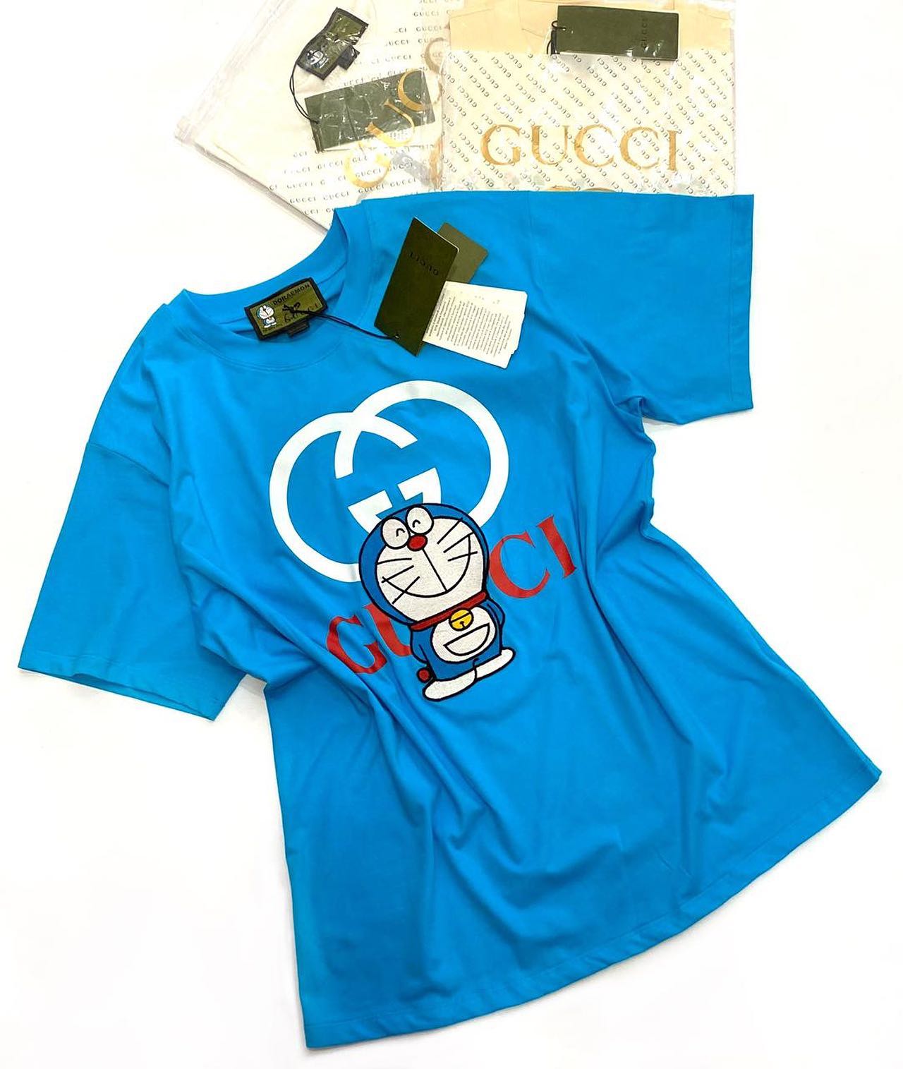Gucci Футболка женская LUX-43548 представляет собой стильную и яркую модель, выполненную в голубом цвете. Дизайн футболки украшен узнаваемым логотипом Gucci и изображением популярного персонажа Дораэмона, что придает ей уникальный и playful вид. Эта футболка идеально подойдет для создания непринужденных повседневных образов, сочетая в себе комфорт и модные тенденции.