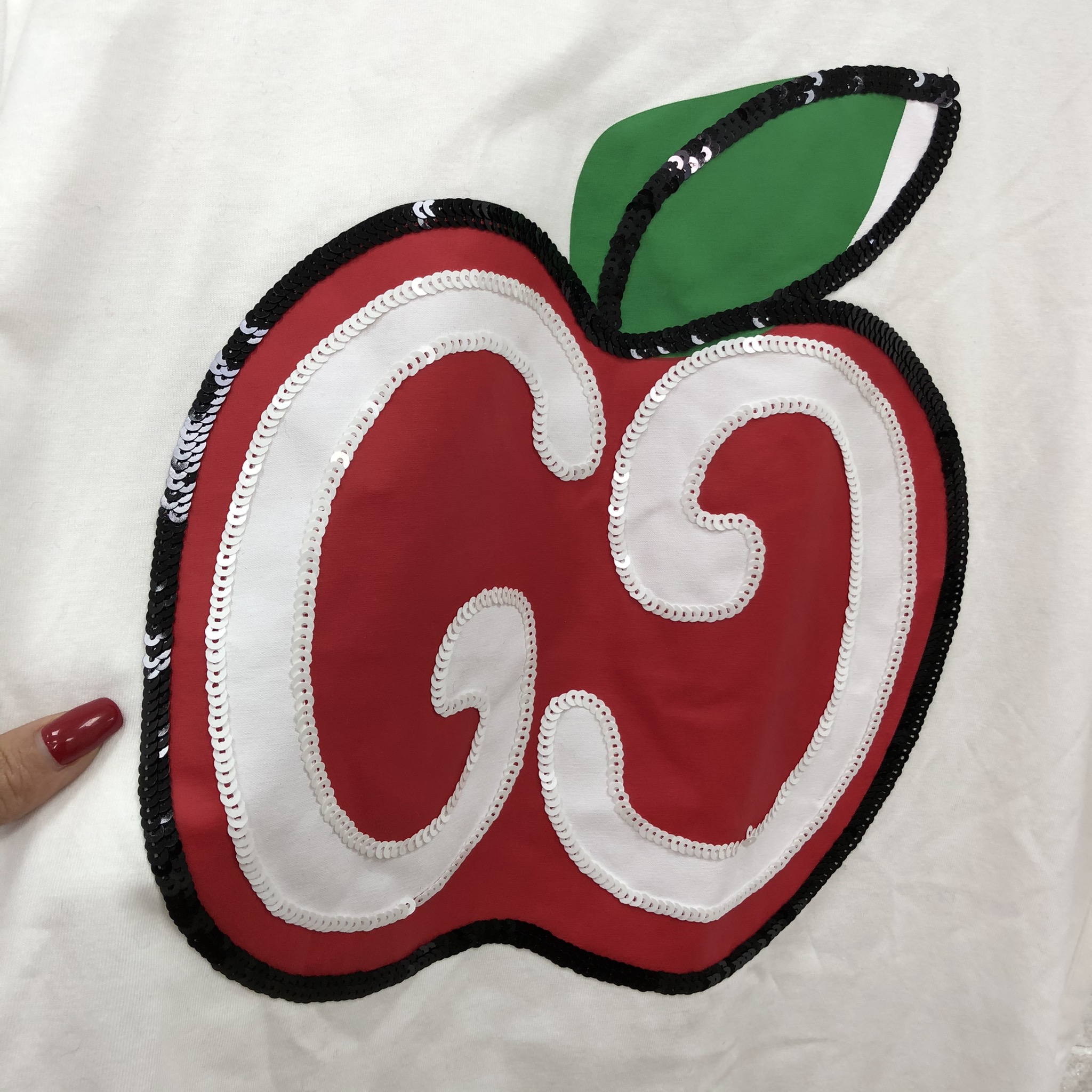 Женская футболка Gucci LUX-22444 — это стильный и яркий элемент гардероба, который добавит игривости любому образу. Дизайн футболки выполнен в современном стиле casual, идеально подходящем для повседневных выходов. Оригинальный принт в виде яблока с деталями из пайеток и контрастных элементов придает ей уникальность.