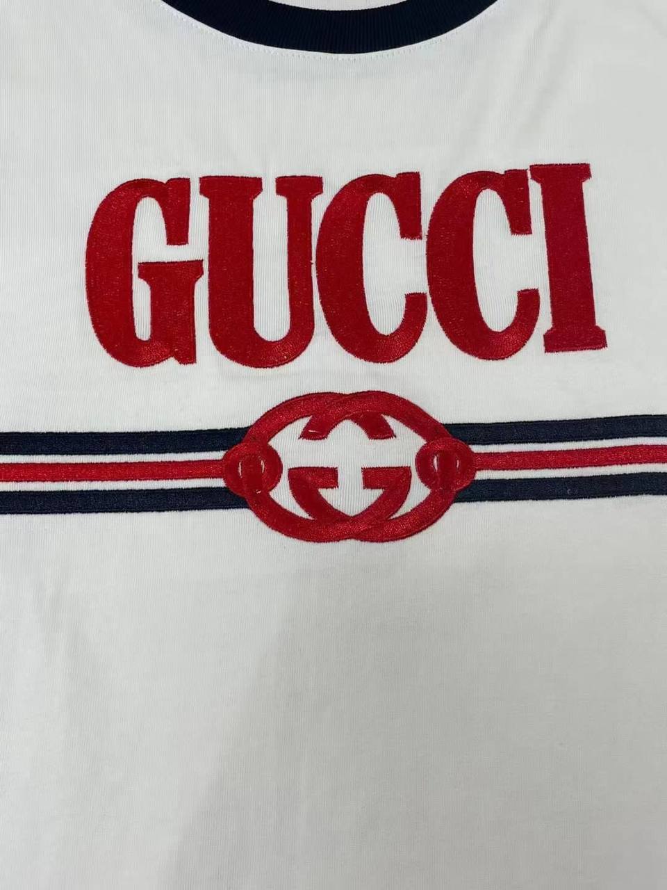 Футболка женская Gucci LUX-92292 – это стильная футболка от известного бренда. Основной цвет футболки — белый, с контрастными темно-синими деталями на воротнике и рукавах. На груди расположен крупный логотип бренда в красном цвете.