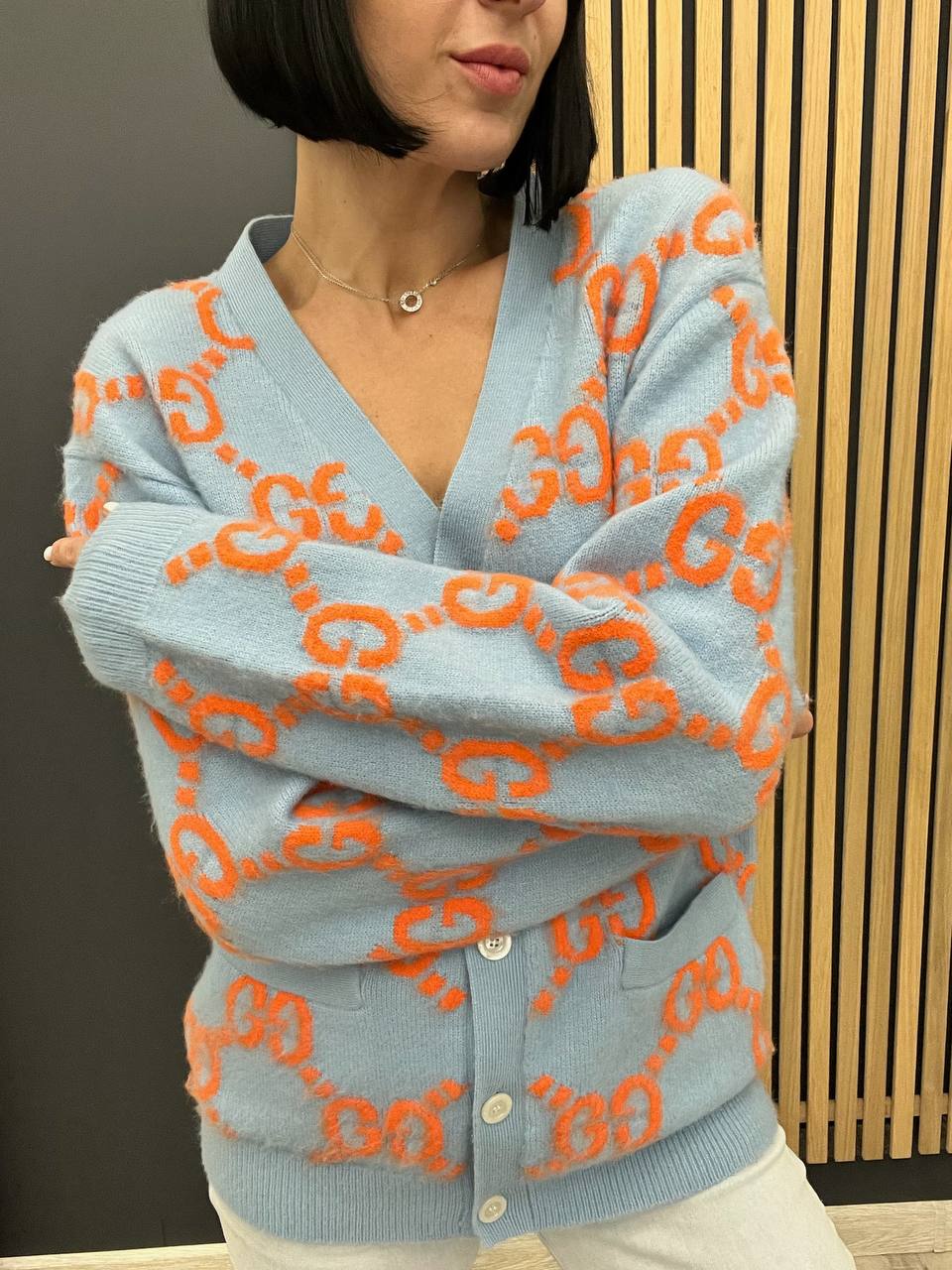 Кардиган Gucci LUX-106359 – это воплощение стиля и комфорта. Кардиган выполнен в нежно-голубом цвете с оранжевым логотипом бренда. Он имеет классический крой с V-образным вырезом и удобными карманами, что делает его идеальным выбором для повседневной носки.