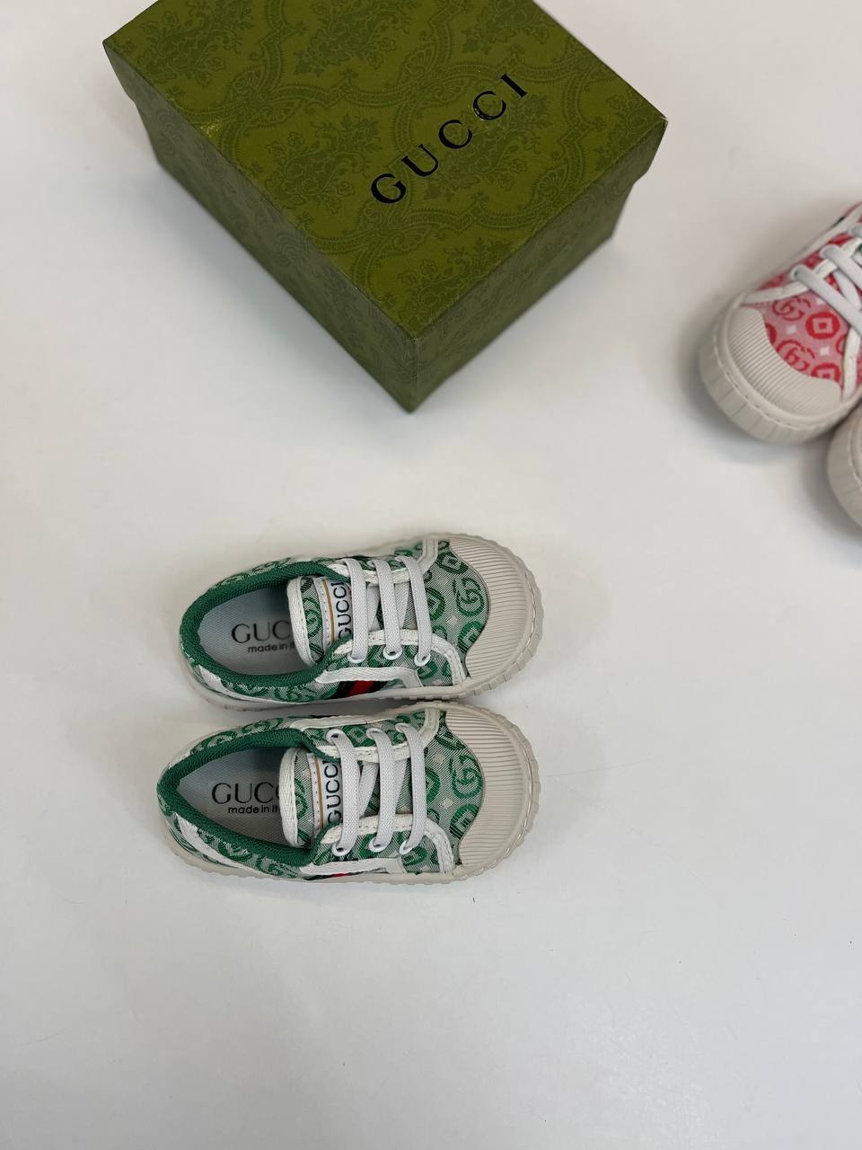 Кеды Gucci LUX-101324 – это стильная обувь для повседневной носки, представленная в ярком дизайне. Кеды выполнены в основном в зеленом цвете с узнаваемым логотипом бренда, что придает им узнаваемость и особый шарм. Белая подошва и шнурки контрастируют с основным цветом, создавая гармоничный образ.