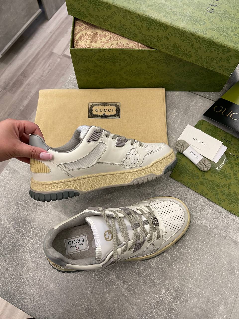 Кеды мужские Gucci LUX-104765 представляют собой стильную обувь в спортивном стиле. Белый цвет, в сочетании с серыми и бежевыми деталями, придает кедам современный и элегантный вид. Они идеально подойдут для повседневной носки, подчеркивая индивидуальность и вкус своего обладателя.