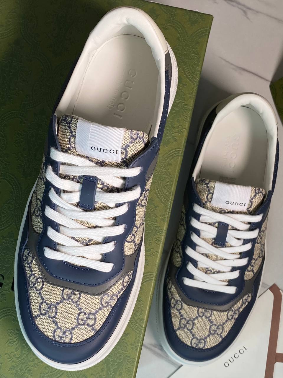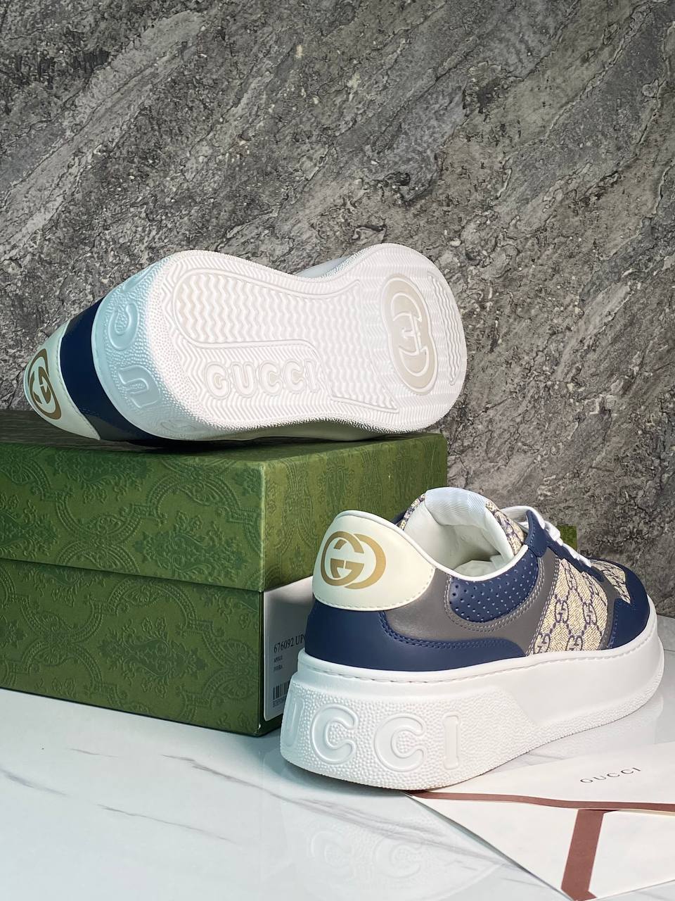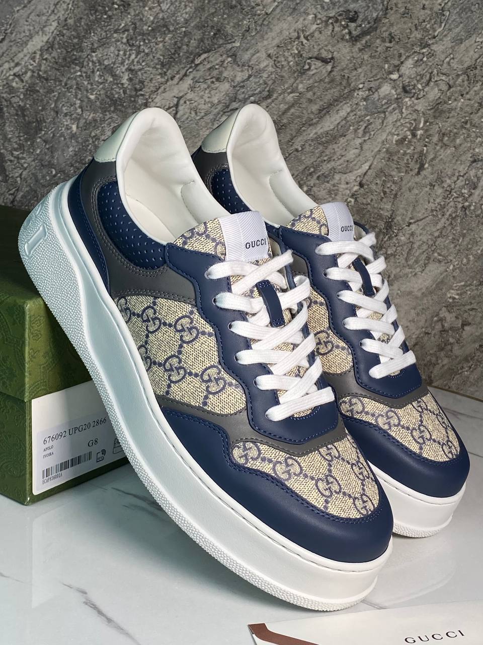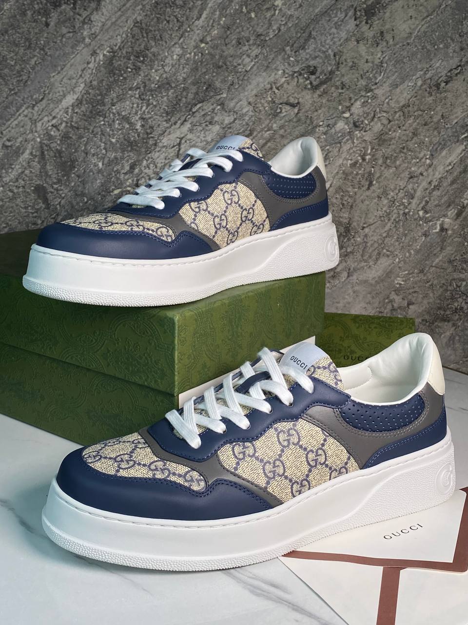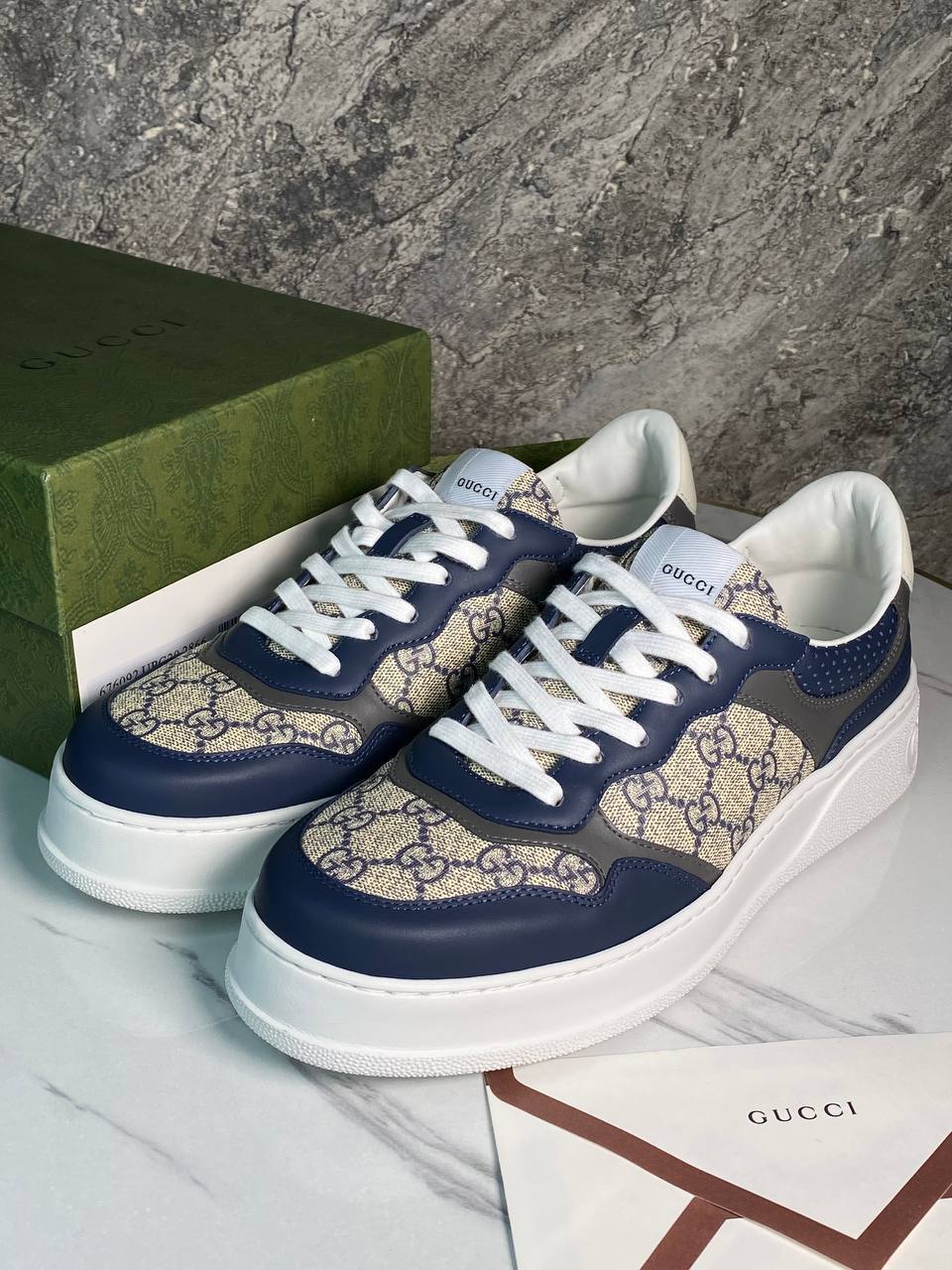 Кеды мужские Gucci LUX-112677 представляют собой стильную обувь премиум-класса, сочетающую в себе узнаваемый дизайн и комфорт. Эти кеды выполнены в синем, сером, белом и бежевом цветах, с характерным узором на ткани и логотипом бренда. Идеальный выбор для создания повседневного образа в сочетании с джинсами или брюками.