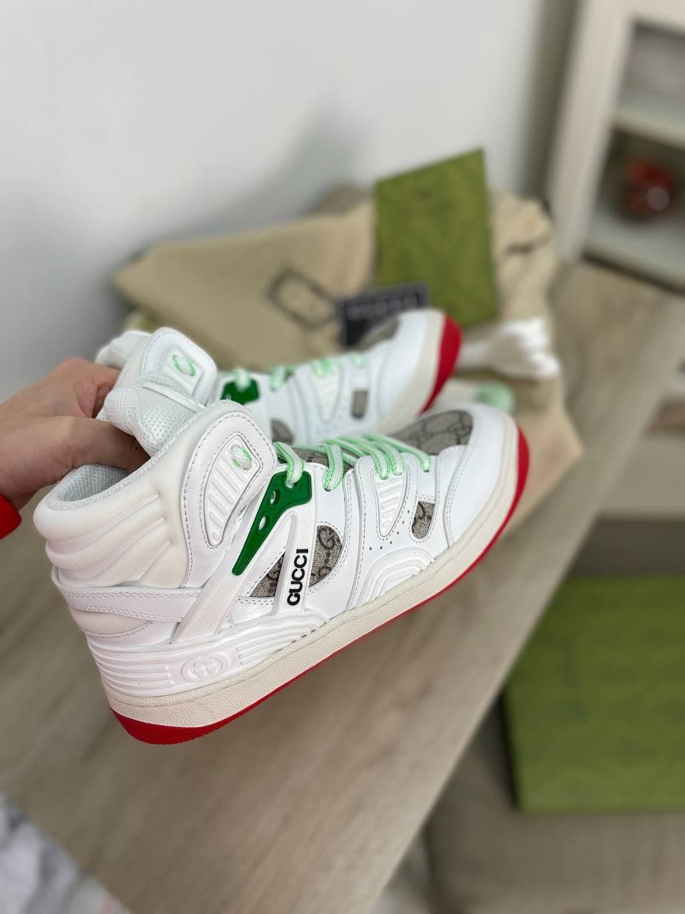 Эти кеды женские Gucci LUX-63059 представляют собой стильное решение для создания непринужденных образов. Модель выполнена в высоком профиле, сочетая в себе элементы спортивного дизайна и узнаваемой эстетики бренда. Белый цвет с акцентами зеленого и фирменным принтом Gucci создает эффектный контраст, делая обувь заметной деталью вашего гардероба.
