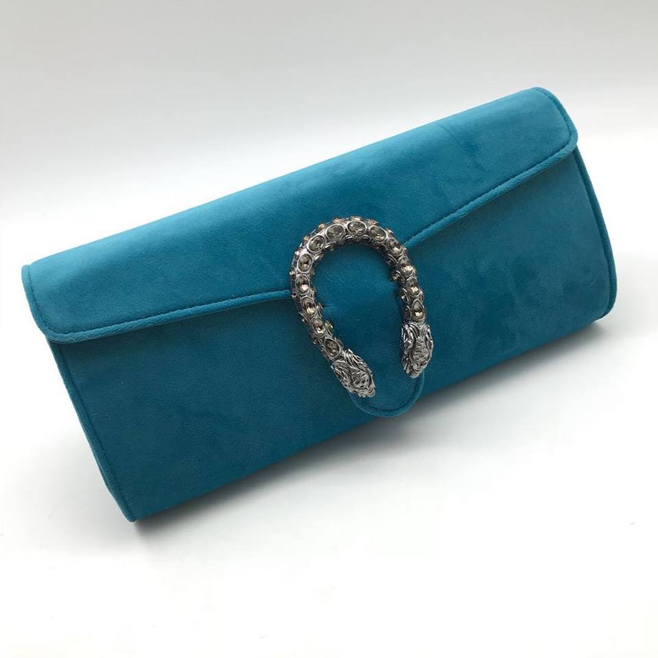Клатч Gucci СЖ-767 представляет собой элегантный аксессуар, выполненный в ярком бирюзовом цвете. Дизайн клатча дополнен роскошной металлической застежкой в форме подковы, украшенной головами змей и инкрустированной камнями, что придает изделию утонченный вид. Эта модель идеально подходит для вечерних выходов и особых случаев, добавляя завершающий штрих к любому образу.