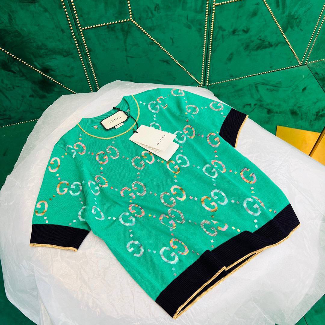 Эта яркая зеленая кофта Gucci LUX-68654 с короткими рукавами и культовым принтом GG, напоминающим аргайл, является воплощением элегантности и стиля. Дизайн дополнен черными манжетами и воротником с золотистой отделкой, создавая контрастный и изысканный образ. Кофта идеально подходит для создания модных повседневных и вечерних нарядов, подчеркивая статус и хороший вкус владельца.