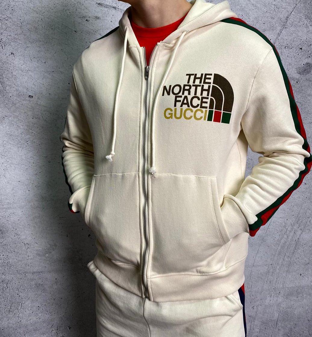 Кофта Gucci LUX-46370 представляет собой стильную и современную модель, сочетающую узнаваемые элементы Gucci с дизайном, вдохновленным эстетикой спортивной одежды. Бежевый цвет кофты, контрастные зеленые и красные полосы на рукавах, а также коллаборационный логотип The North Face x Gucci придают изделию уникальный вид. Эта кофта идеально подходит для создания расслабленных, но при этом модных образов.