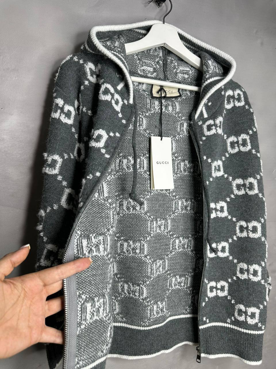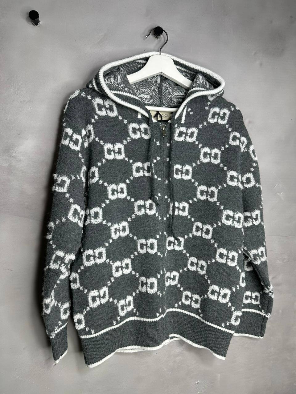 Кофта Gucci LUX-110991 — это стильная кофта с капюшоном в серо-белой цветовой гамме. На ткани расположен знаковый принт GG. Такая кофта отлично подойдет для создания модных повседневных образов.
