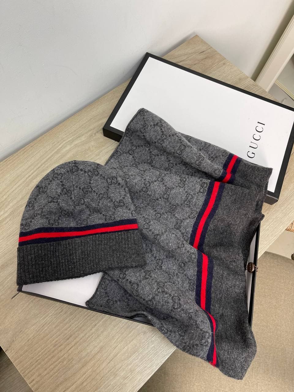 Этот комплект, состоящий из шапки и шарфа, от бренда Gucci выполнена в классическом стиле, идеально подходящем для холодного времени года. Дизайн украшен узнаваемым монограммным принтом бренда, а контрастные полосы в темно-синем и красном цветах добавляют элегантности. Комплект станет стильным дополнением к вашему повседневному образу, обеспечивая тепло и комфорт.