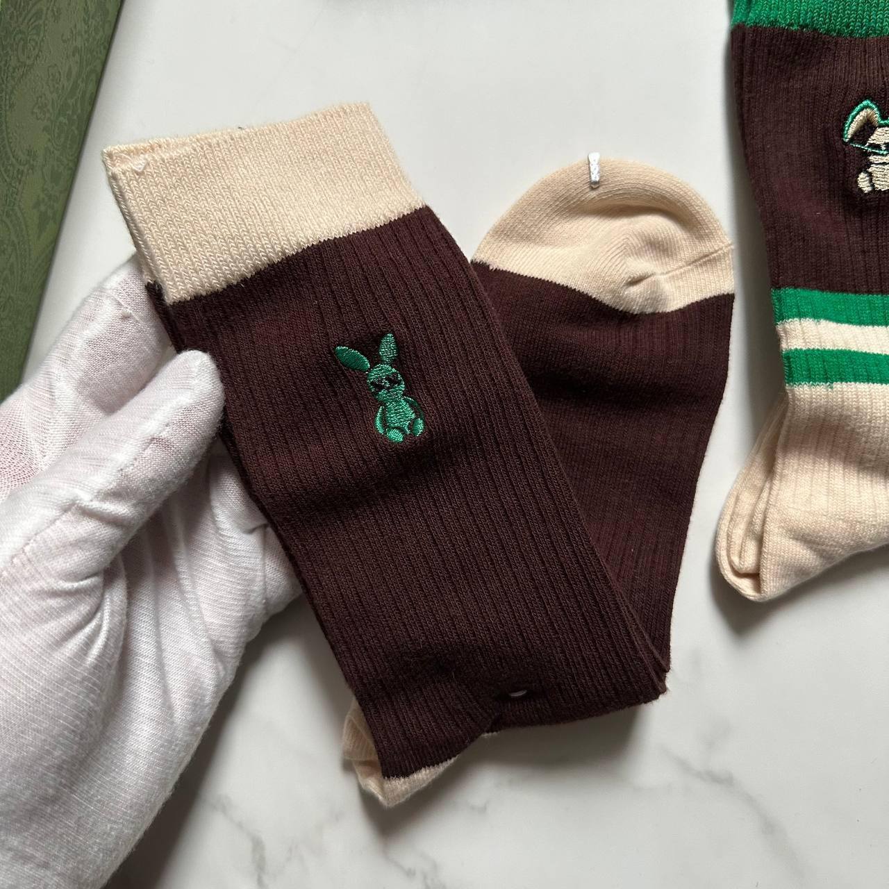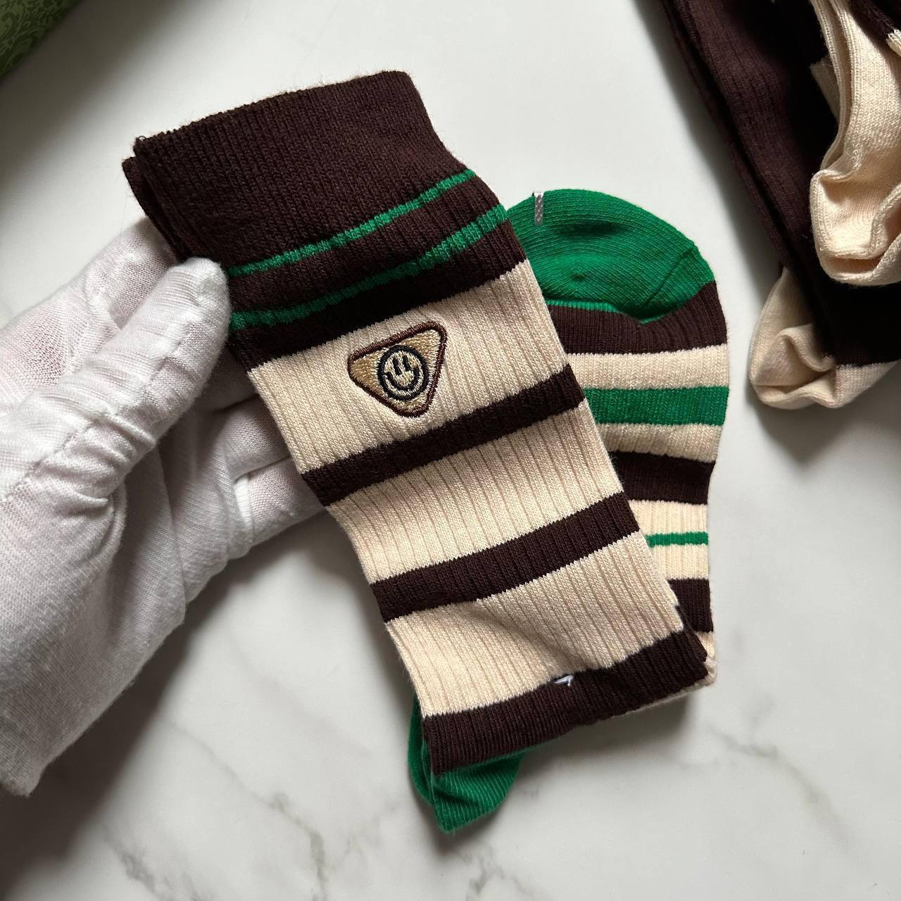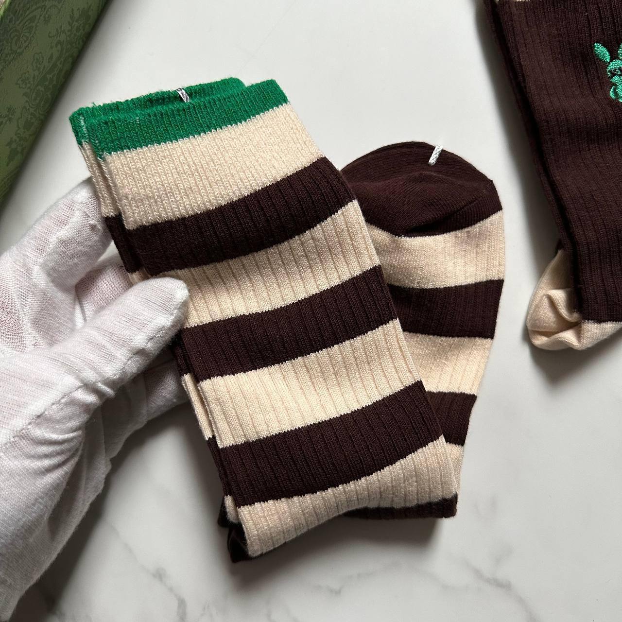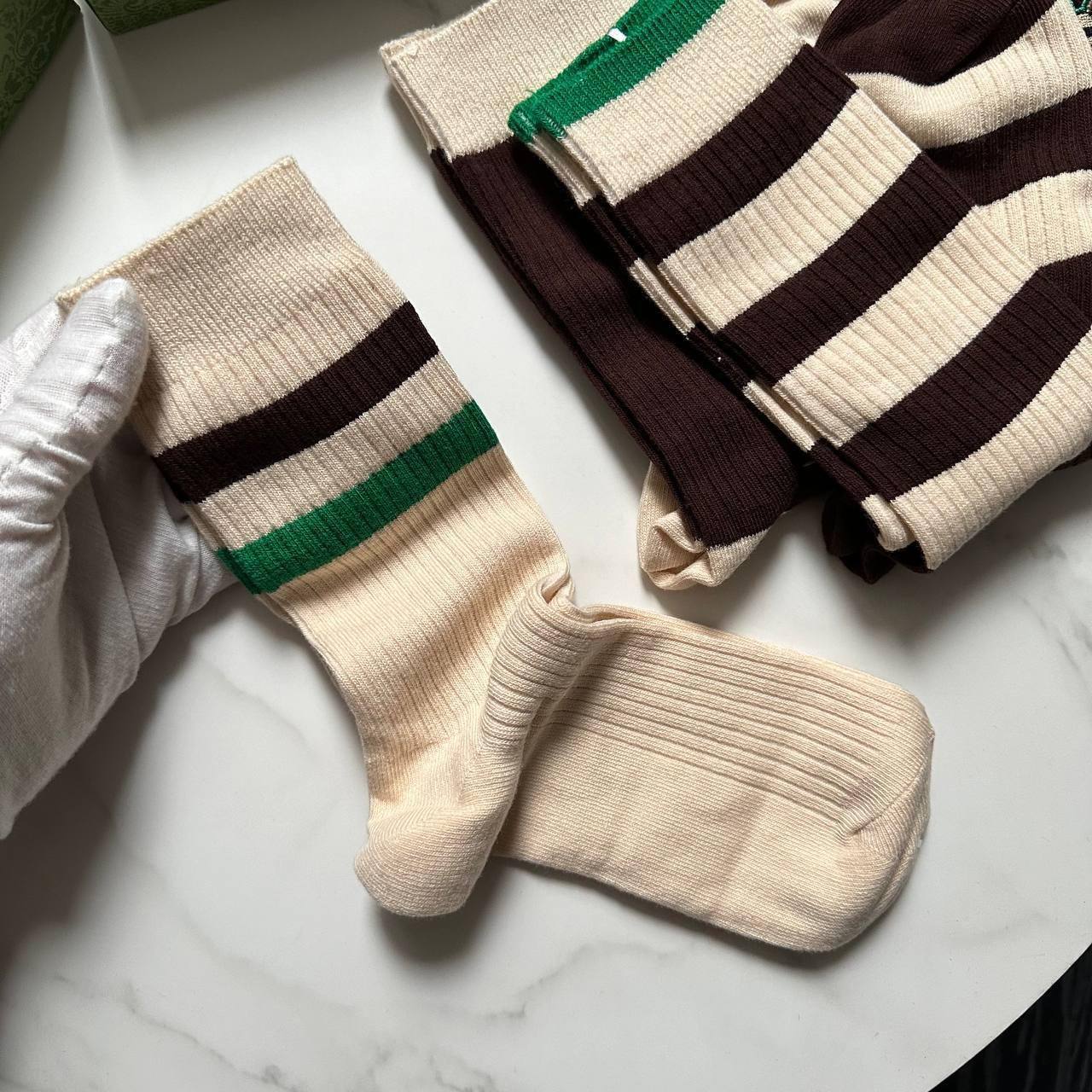 Комплект Gucci LUX-98557 - это стильный аксессуар, который подчеркнет ваш безупречный вкус. Комплект состоит из нескольких пар носков, выполненных в фирменных цветах бренда. Носки имеют разнообразный дизайн: полосатый принт и декоративные элементы в виде вышивки.