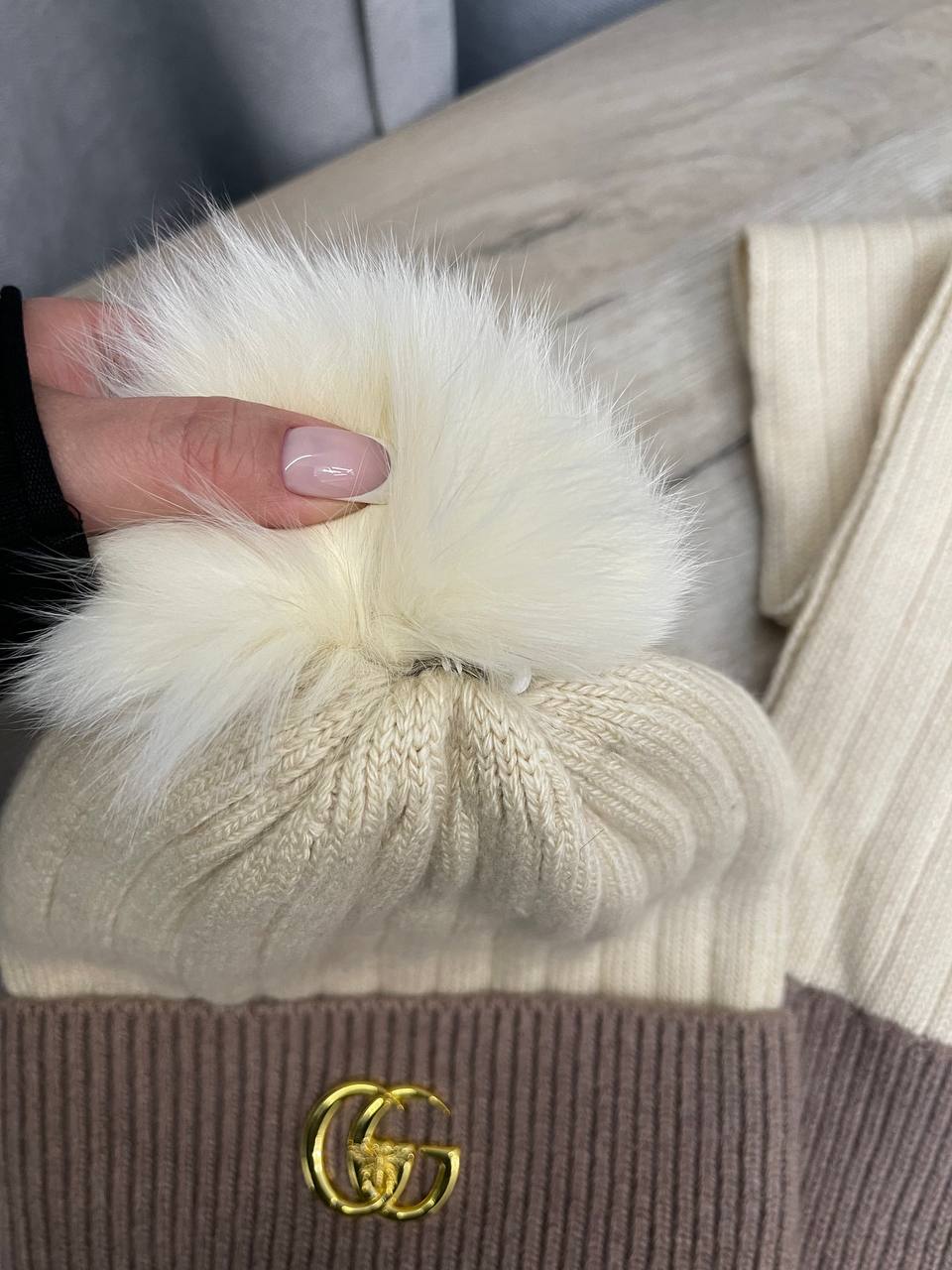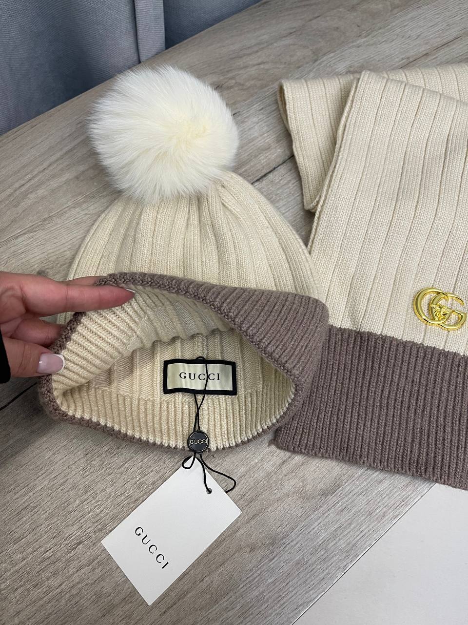 Комплект Gucci LUX-111449 – это стильный аксессуар, который сочетает в себе элегантность и комфорт. Комплект состоит из шапки с помпоном и шарфа, выполненных в сочетании кремового и коричневого цветов. Этот комплект идеально подойдет для создания повседневных и модных образов.
