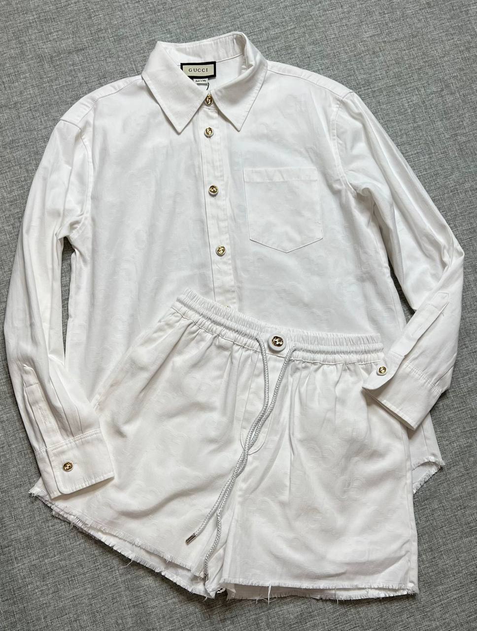 Костюм Gucci LUX-92823 — это стильный комплект, включающий рубашку с длинными рукавами и шорты. Белый костюм дополнен золотистой фурнитурой, которая добавляет элегантности. Идеален для создания как повседневных, так и более формальных образов.
