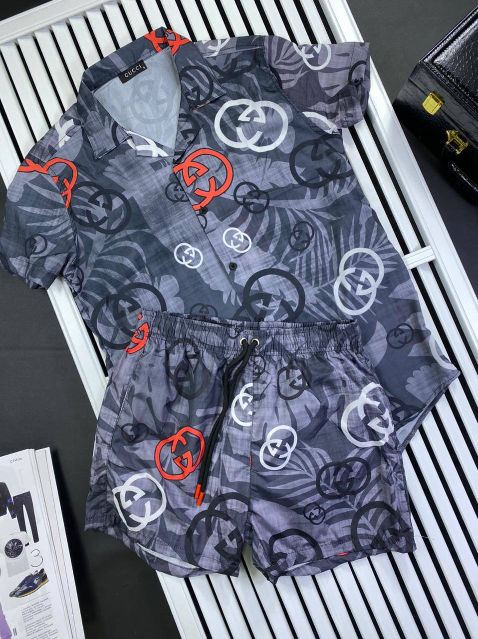 Этот стильный мужской костюм Gucci LUX-49369, состоящий из рубашки и шорт, идеально подходит для летнего отдыха и повседневного ношения. Комплект выполнен в уникальном дизайне с принтом из узнаваемых логотипов бренда и тропических листьев, что придает ему изысканный и модный вид. Яркие акценты в виде красных элементов логотипа добавляют динамичности.