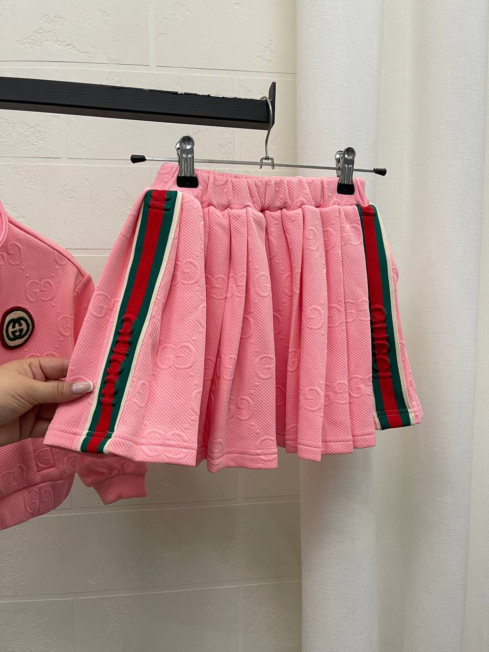 Костюм Gucci LUX-101697 — это стильный ансамбль в розовом цвете, сочетающий спортивный и элегантный стиль. Комплект включает куртку на молнии и юбку. Текстура ткани с логотипом бренда придает изделию узнаваемость и особый шарм.