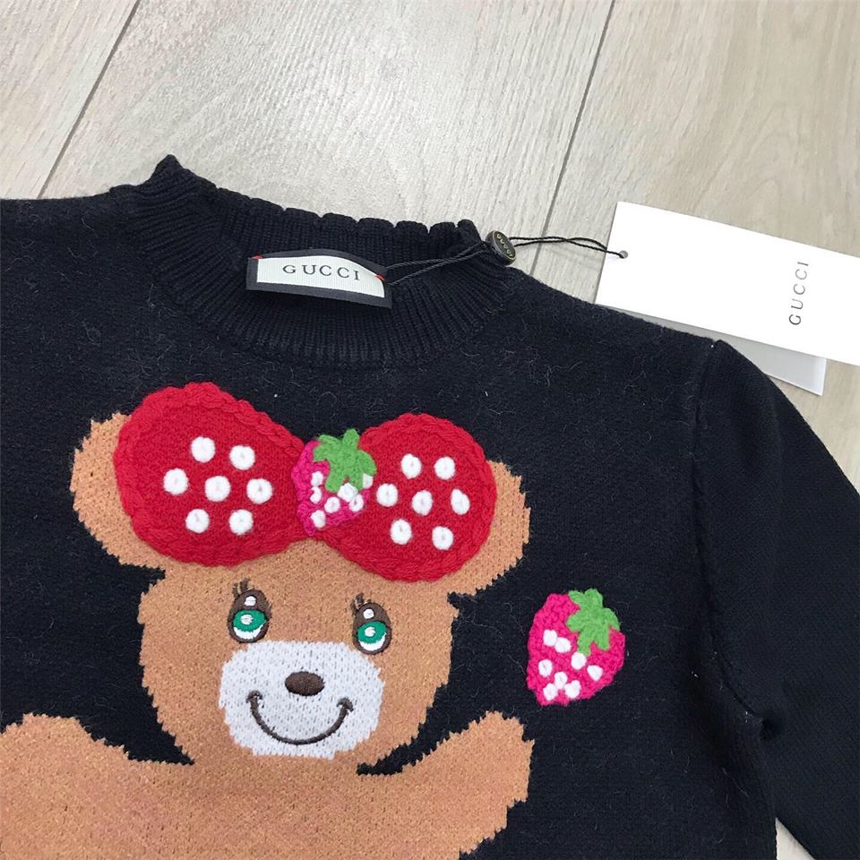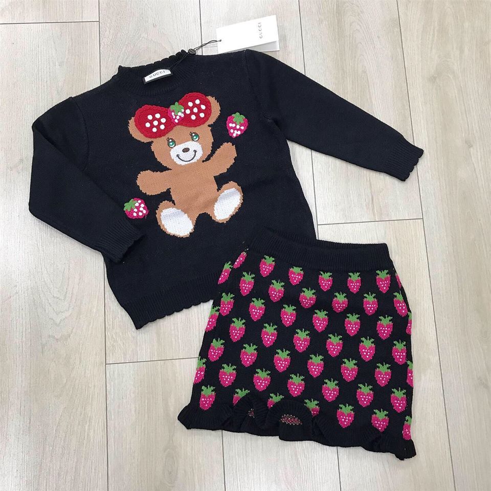 Этот детский костюм Gucci LUX-27513, состоящий из черного джемпера и юбки, выполнен в игривом стиле. Джемпер украшен крупным изображением милого медвежонка с красным бантом в горошек и ягодами клубники, а юбка полностью покрыта принтом из клубничек. Комплект идеально подойдет для юных модниц, которые любят выделяться.