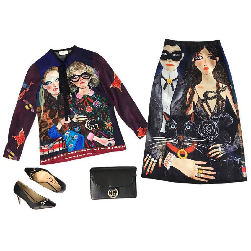 Представленный костюм Gucci LUX-50830 – это яркий и экстравагантный комплект, состоящий из блузы и юбки. Дизайн выполнен в уникальном стиле, сочетающем в себе художественные принты с изображениями женских фигур, бабочек, и тематические элементы, характерные для бренда Gucci. Этот костюм идеально подходит для создания эффектных образов.