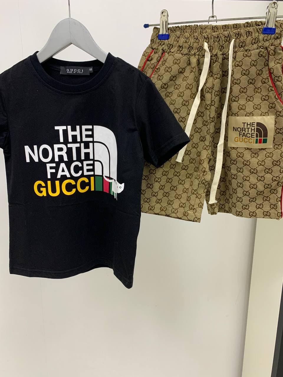 Представленный костюм Gucci LUX-63093 – это стильный и современный комплект, сочетающий в себе узнаваемый дизайн бренда Gucci с элементами спортивной эстетики. Черная футболка с контрастным принтом "The North Face Gucci" и шорты в фирменную монограмму GG создают эффектный образ, идеальный для повседневного ношения и активного отдыха.