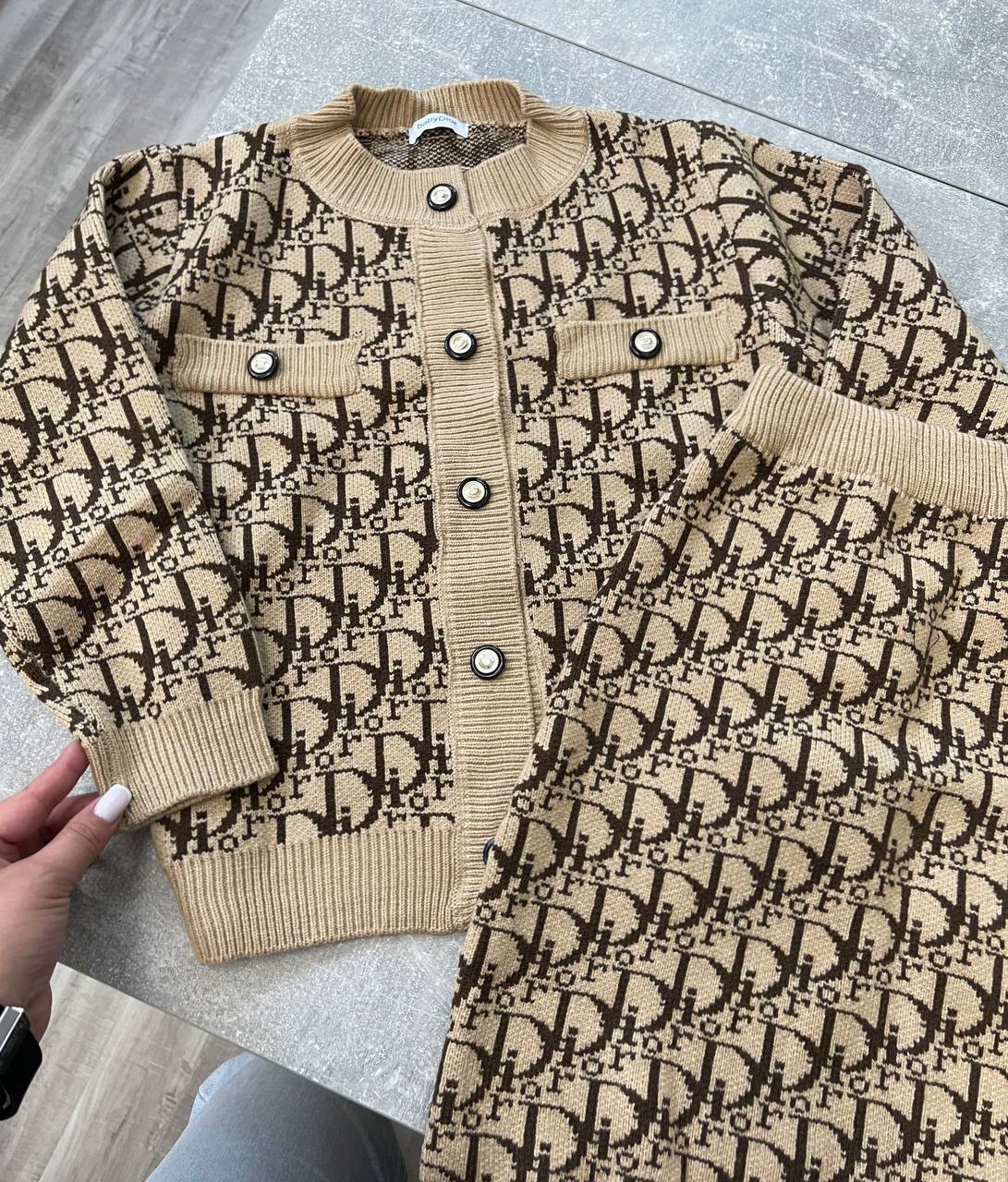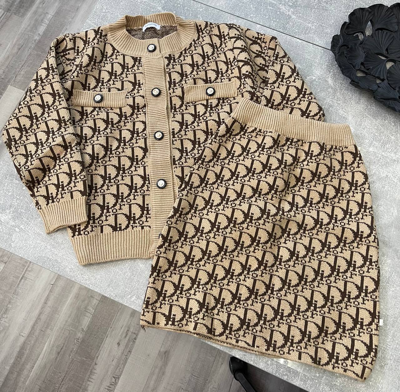 Костюм Dior LUX-94725 — это стильный комплект, сочетающий в себе кардиган и юбку. Костюм выполнен в бежево-коричневой цветовой гамме с узнаваемым логотипом. Он идеально подходит для создания элегантного и комфортного образа.