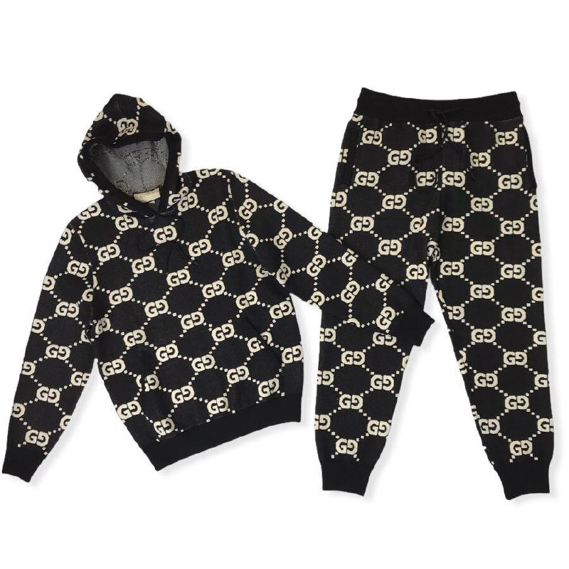 Представленный костюм Gucci LUX-55900 — это стильный комплект, состоящий из худи и брюк, выполненный в узнаваемом монограммном стиле бренда. Дизайн отличается классическим черным цветом с контрастным принтом, что делает его универсальным элементом гардероба. Этот костюм Gucci идеально подходит для создания комфортных и модных образов в повседневном стиле, а также для спортивных занятий.