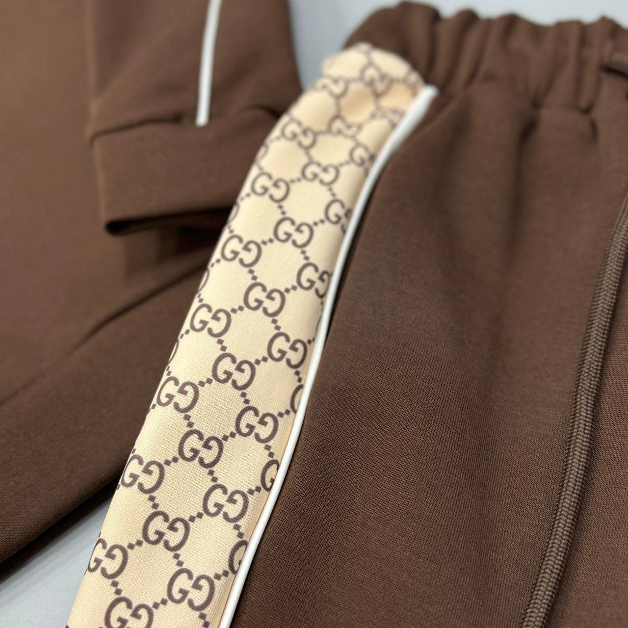 Костюм Gucci LUX-115017 представляет собой стильный спортивный костюм коричневого цвета с узнаваемым узором бренда. Комплект состоит из свитшота и брюк, выполненных в едином дизайне. Костюм подходит для повседневной носки, обеспечивая комфорт и узнаваемый стиль.