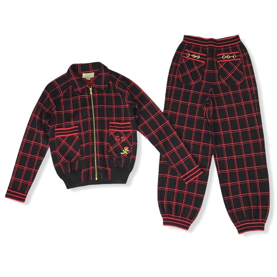 Представленный костюм Gucci LUX-41867 — это стильный комплект, состоящий из куртки-бомбера и брюк, выполненных в эффектной черно-красной клетке. Дизайн дополнен вышивкой в виде розы и инициалами "G" на куртке, а также декоративными элементами на карманах брюк. Этот костюм идеально подходит для создания модного и запоминающегося образа.