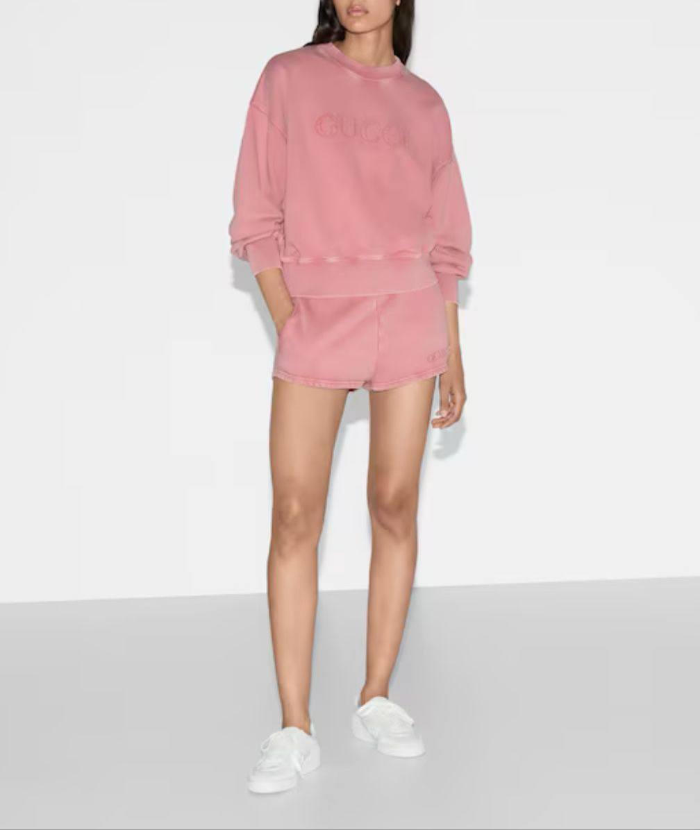 Костюм спортивный Gucci LUX-115886 – это стильный и комфортный комплект, который идеально подходит для создания расслабленных образов в спортивном стиле. Он выполнен в нежном розовом цвете и включает в себя укороченный свитшот с вышитым логотипом бренда и шорты. Костюм выглядит модно и современно, подчеркивая индивидуальность и вкус своей обладательницы.