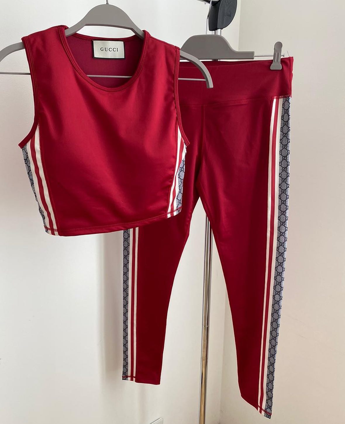 Этот спортивный костюм Gucci LUX-31389 представляет собой стильный комплект, состоящий из кроп-топа и леггинсов. Изделие выполнено в насыщенном бордовом цвете и украшено фирменной монограммой Gucci по боковым сторонам штанин и на топе, а также контрастными белыми и синими полосами. Костюм идеально подходит для активного образа жизни, сочетая в себе модный дизайн и функциональность.